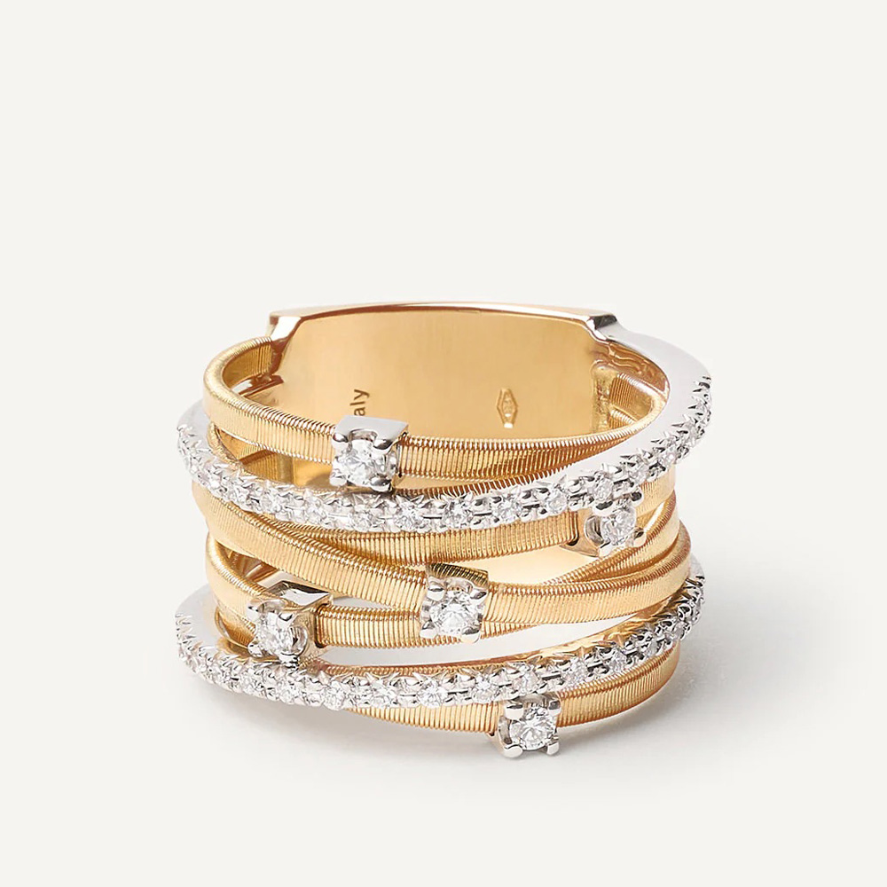 Un gioiello iconico, questo bellissimo anello in oro giallo 18kt è un gioco di intrecci tra fili di spirale piatta, realizzata grazie all’esclusiva lavorazione artigianale del coil, e barrette di pavé di diamanti taglio brillante. Reso ancor più prezioso da una pioggia di diamanti incastonati, è un vero must-have.