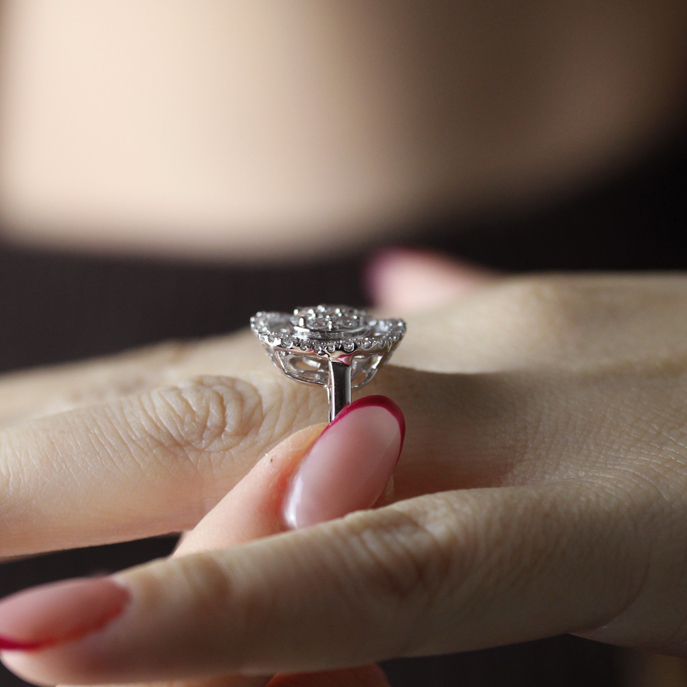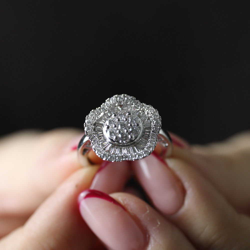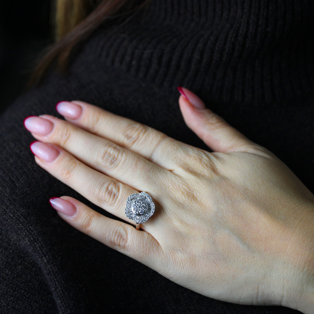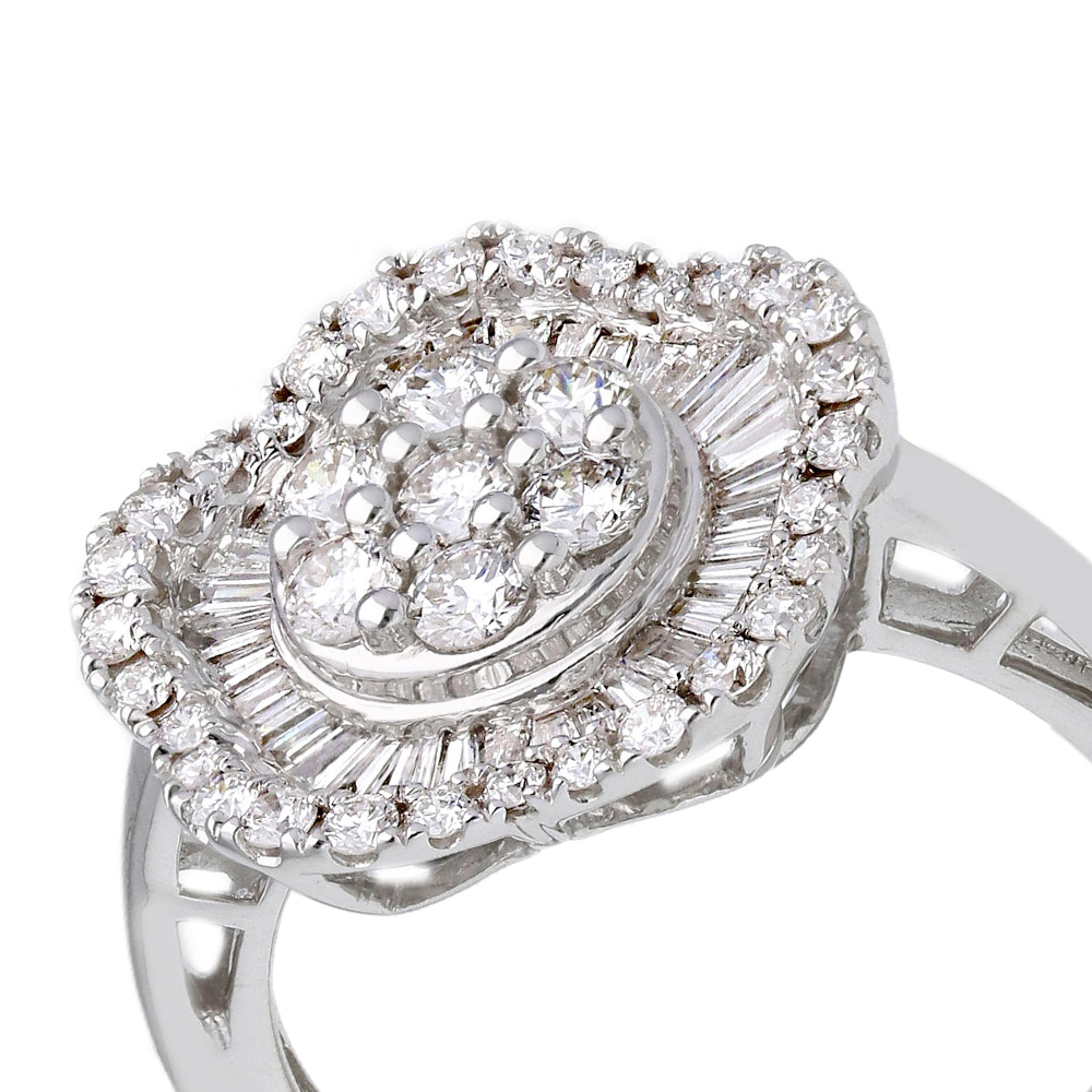 Anello fantasia fiore in oro bianco 18K con diamanti taglio brillante e taglio baguette (1,00 ct - G/H - SI)