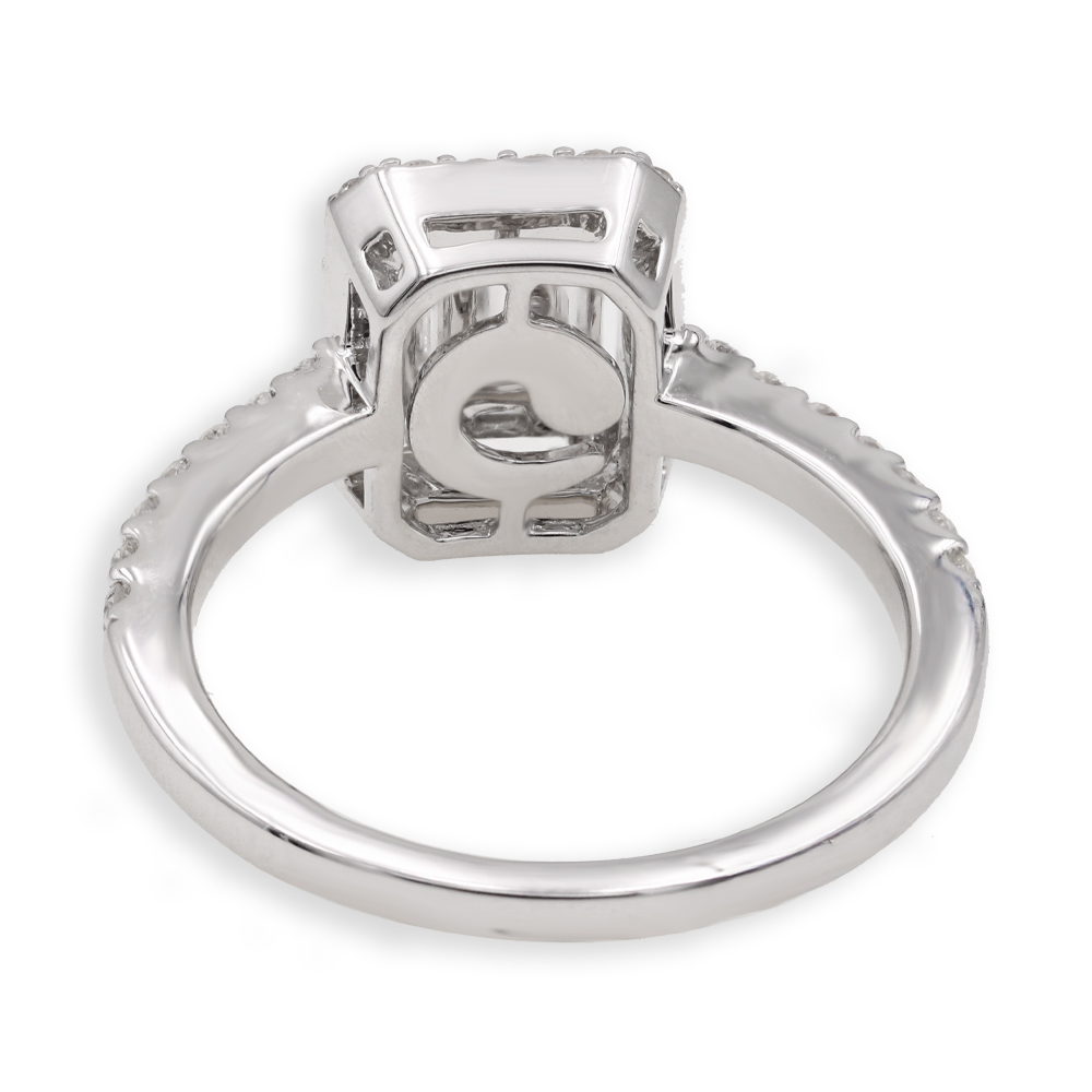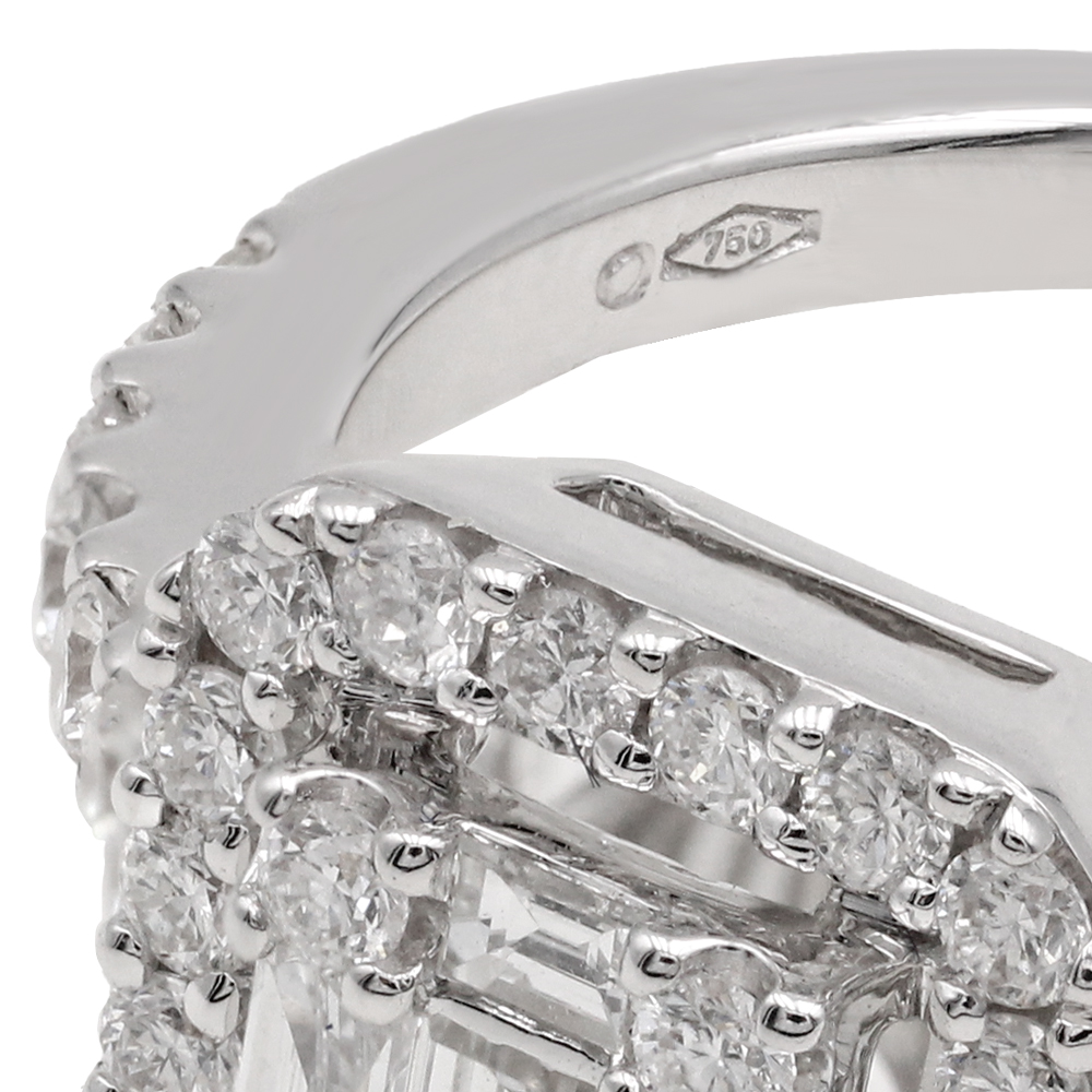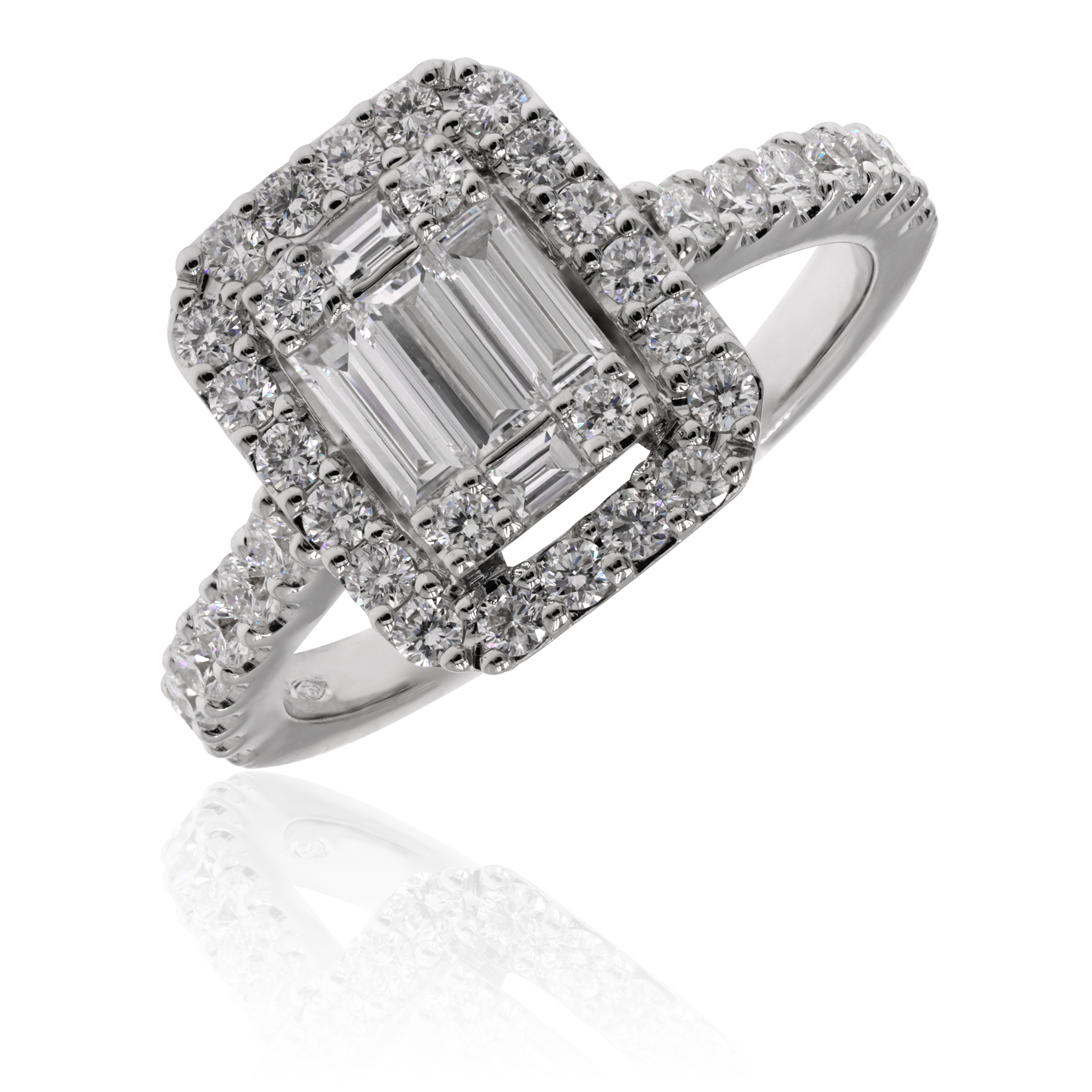 Anello "illusione" in oro bianco 18K con 40 diamanti taglio brillante (ct 0,50 - G - SI) e 5 diamanti taglio baguette (ct 0,28 - G - VS)