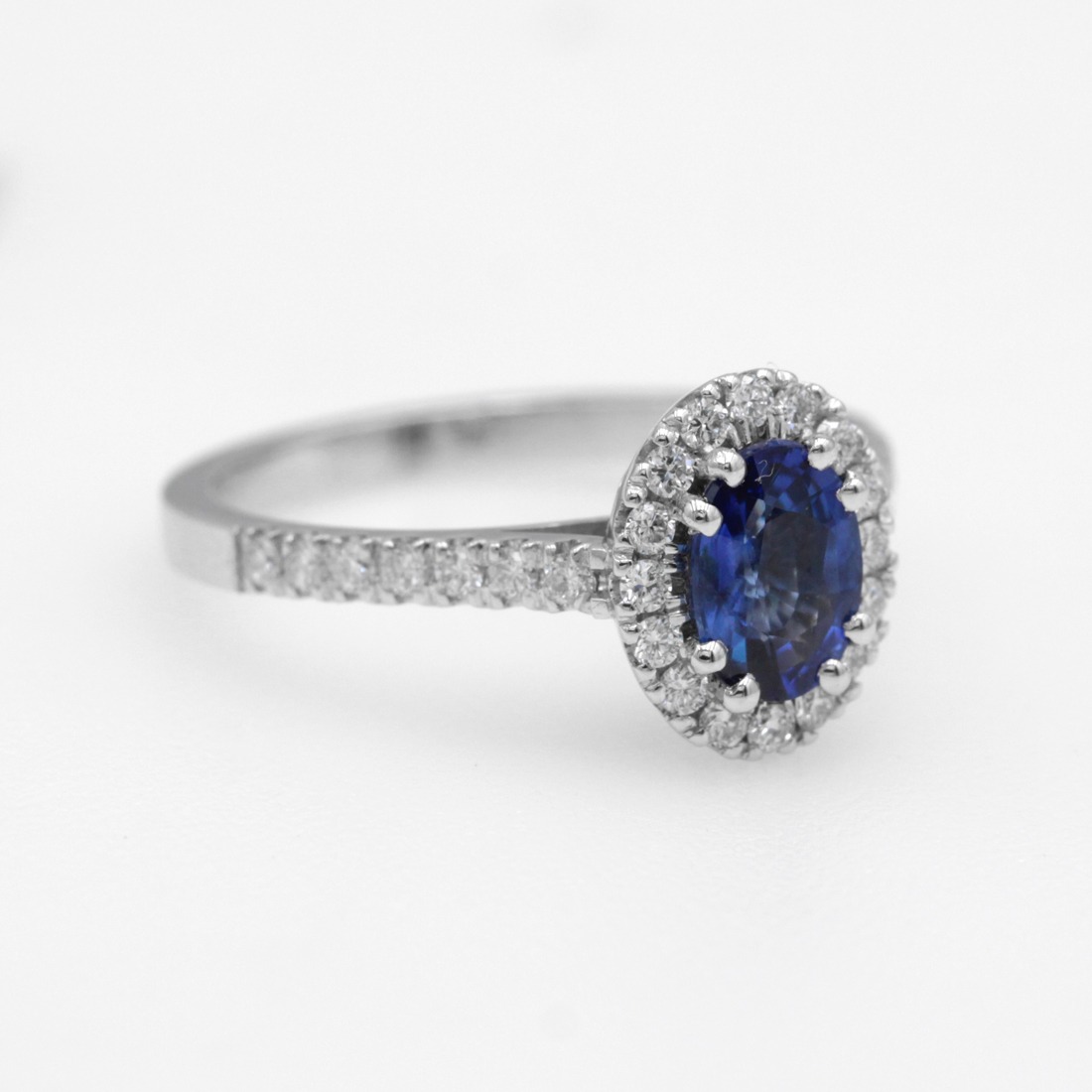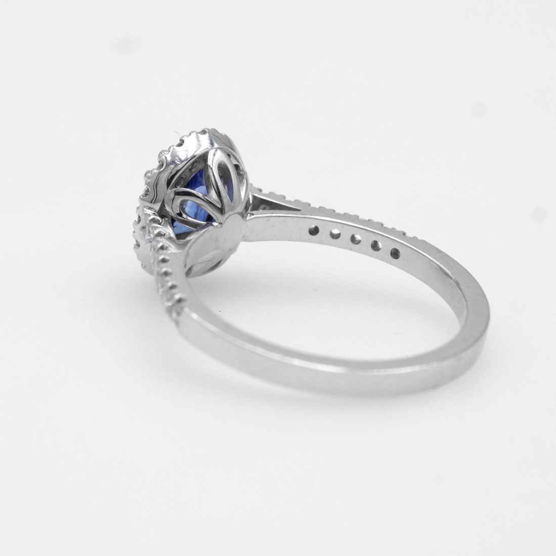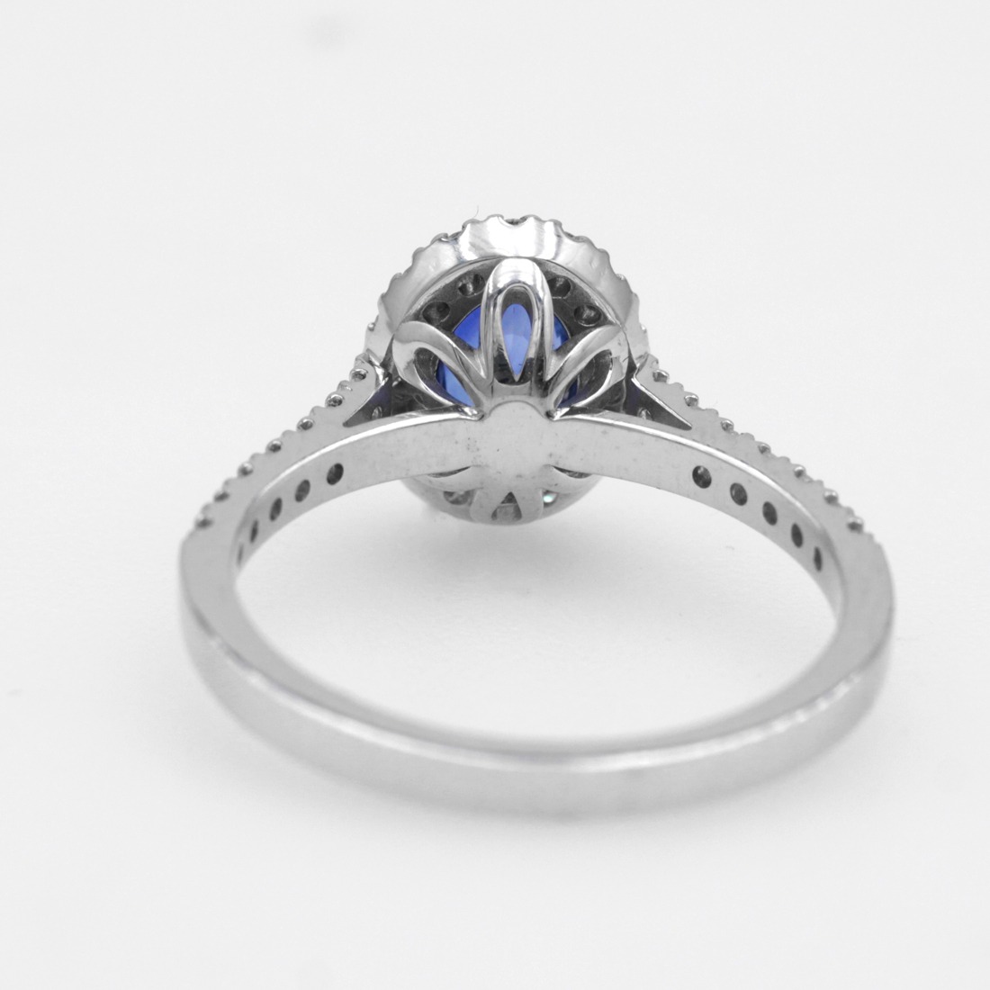 Anello in oro bianco 18K con zaffiro taglio ovale (ct 0,99) e diamanti taglio brillante (ct 0,36)