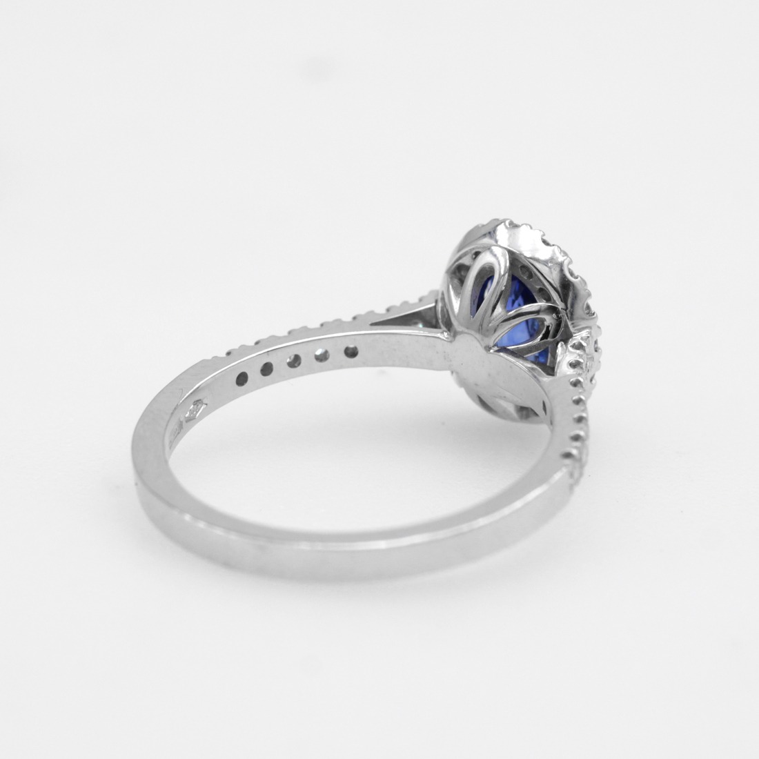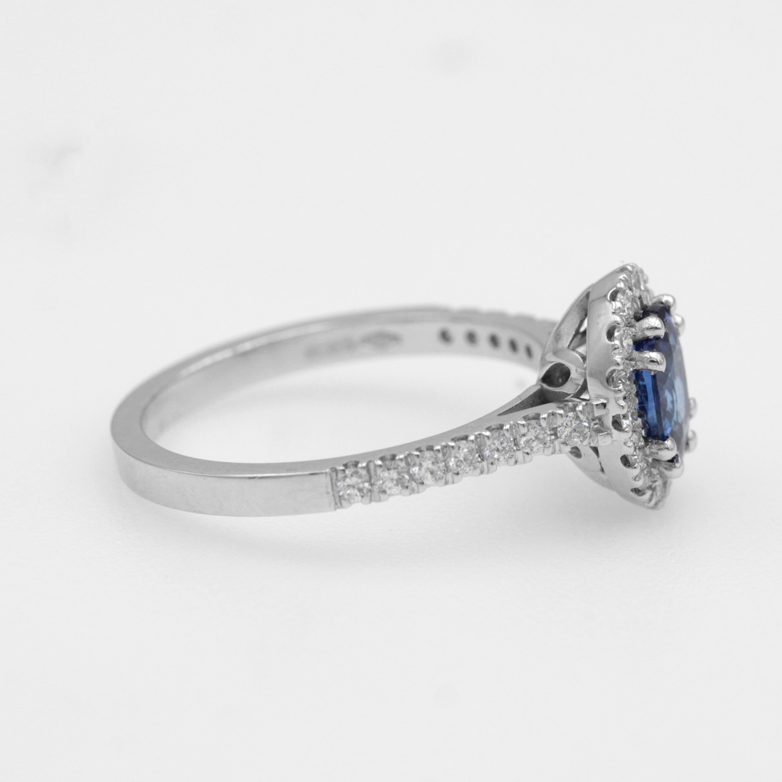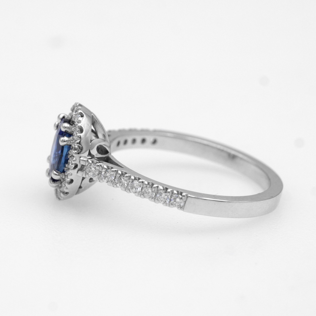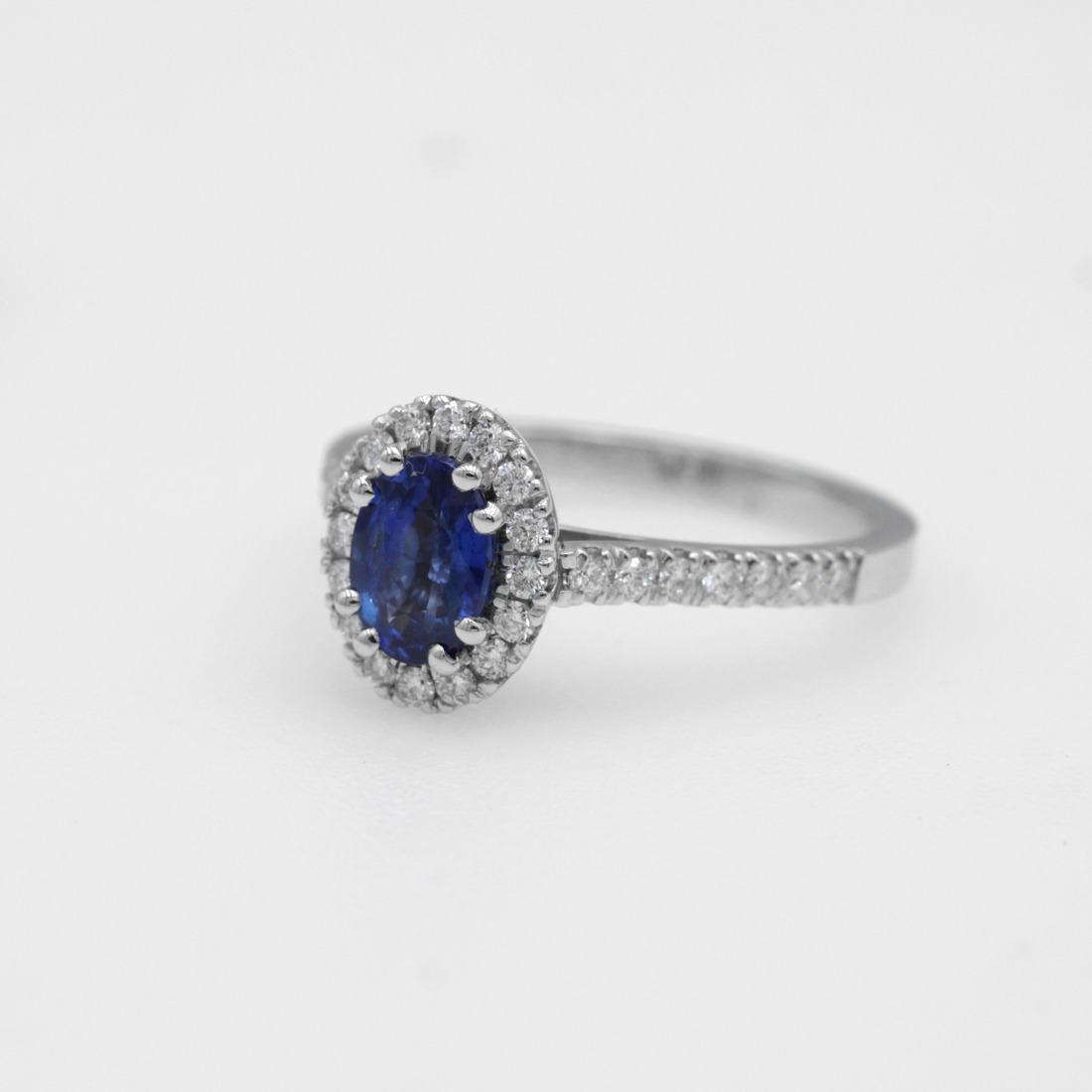Anello in oro bianco 18K con zaffiro taglio ovale (ct 0,99) e diamanti taglio brillante (ct 0,36)