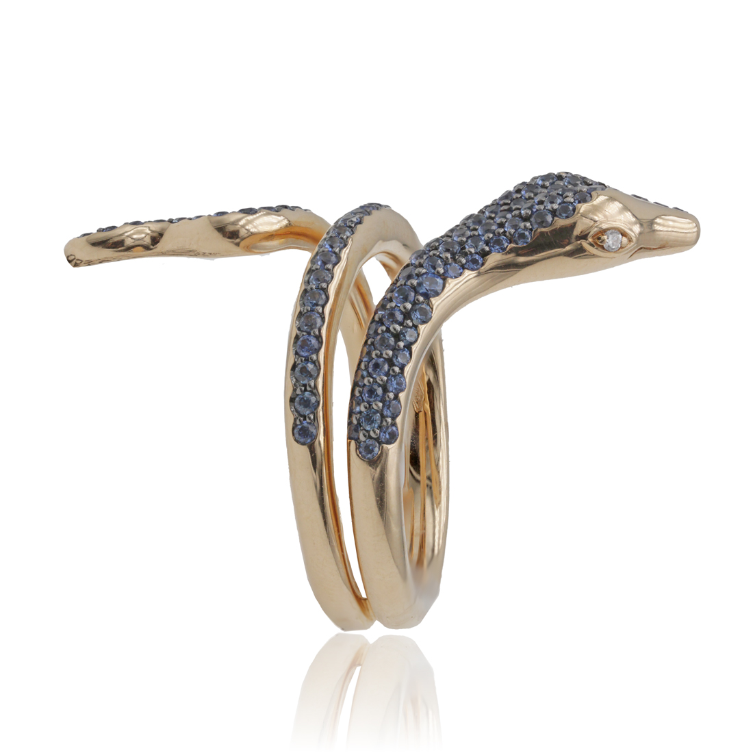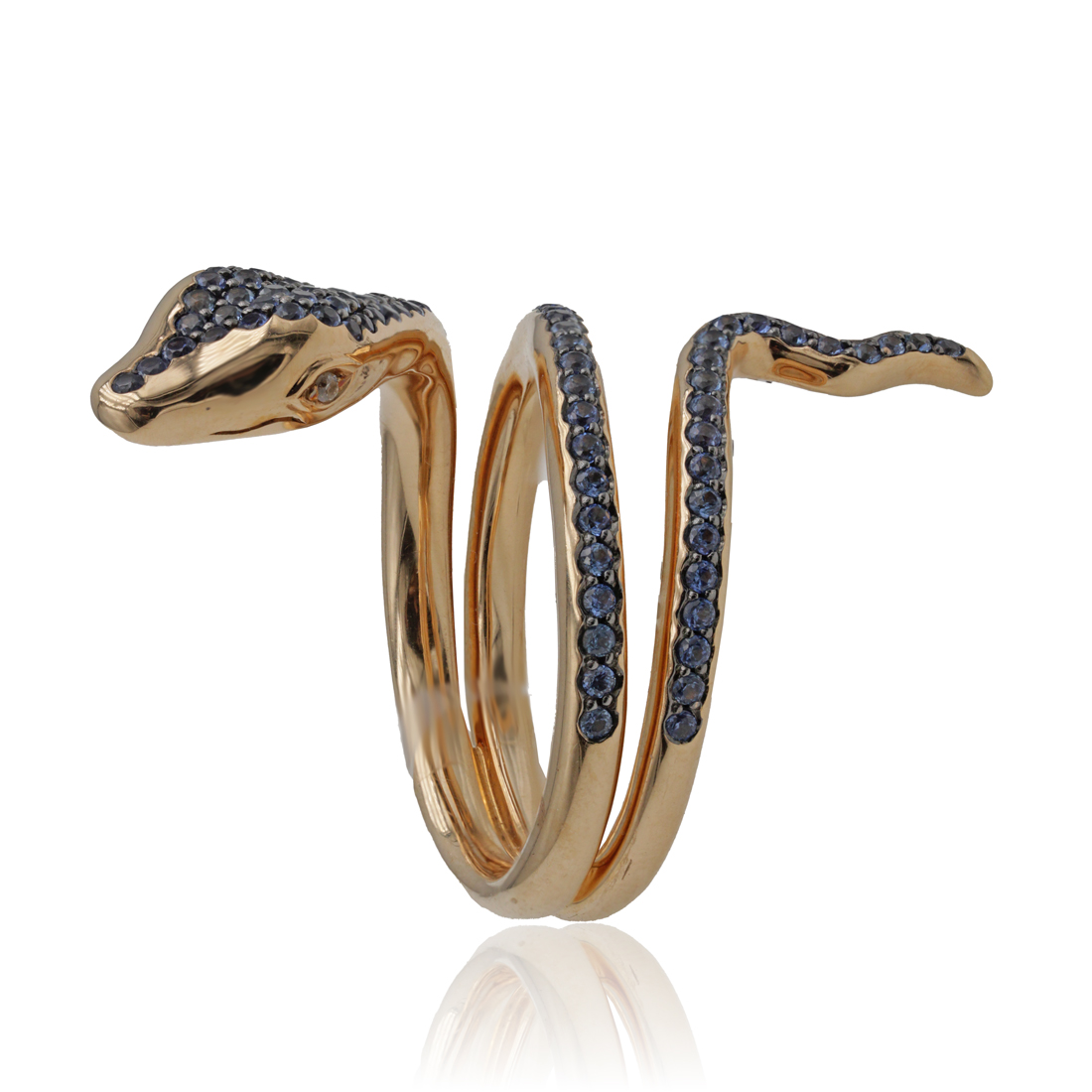 Anello in oro rosa a serpente con zaffiri (ct 0,92) e diamanti (ct 0,02)