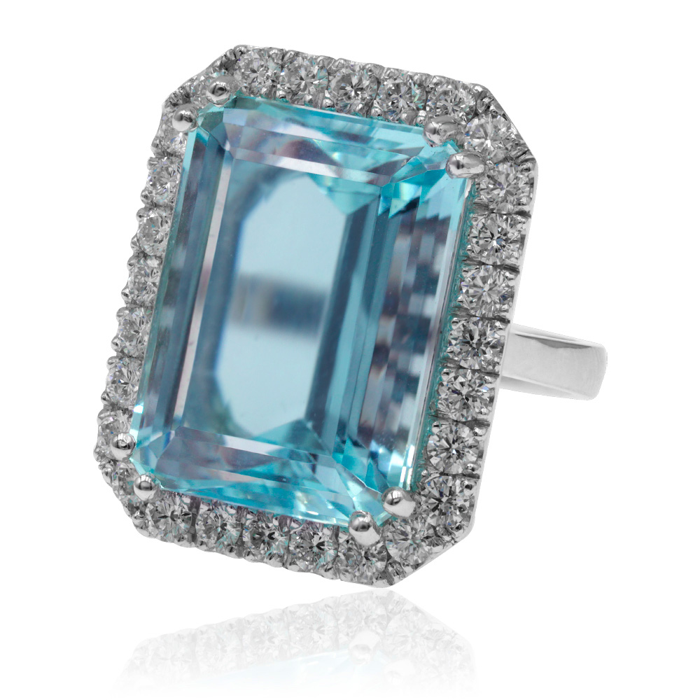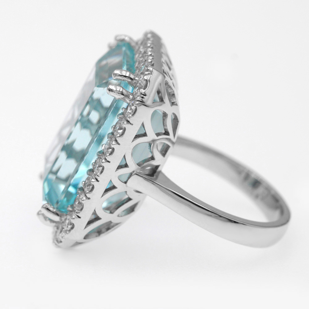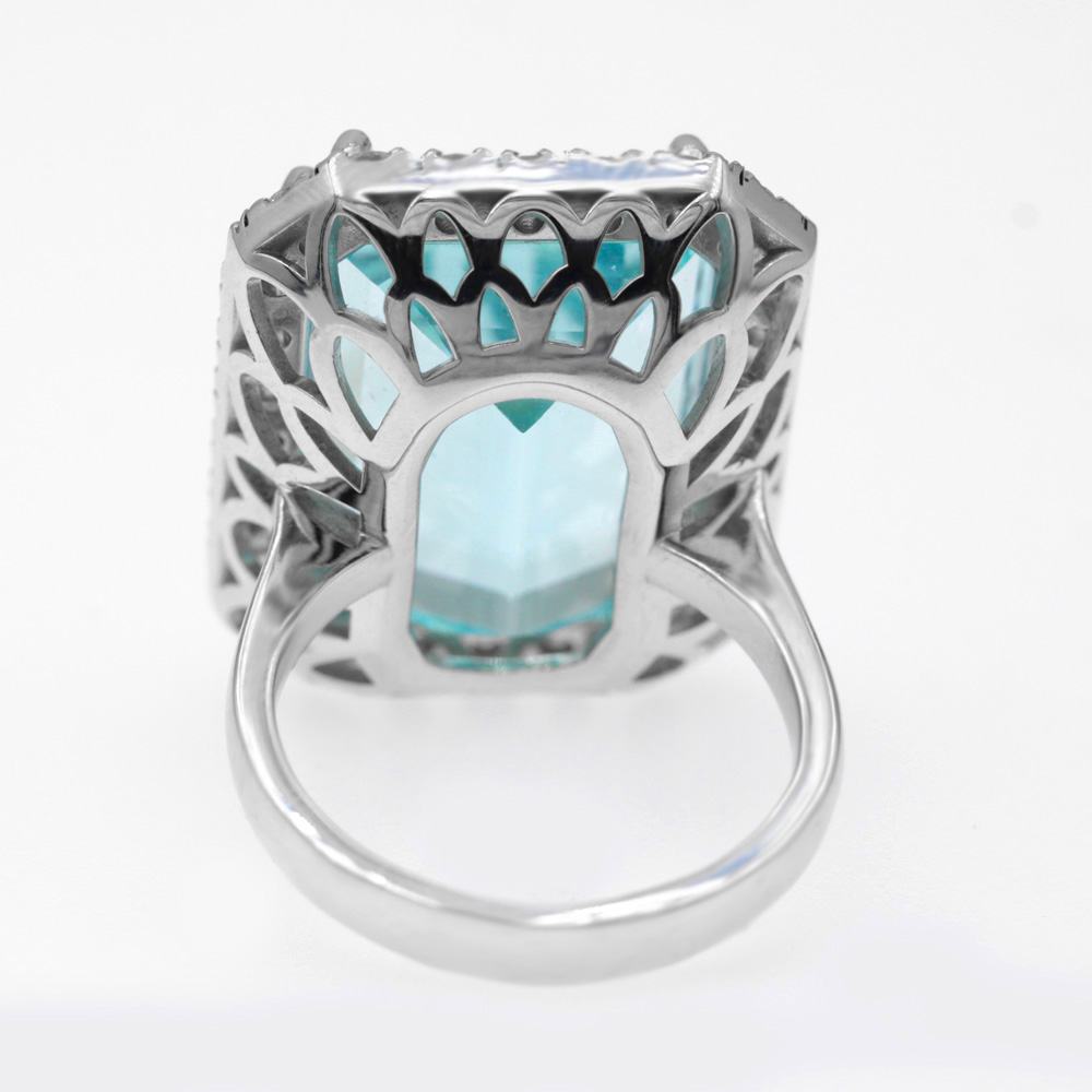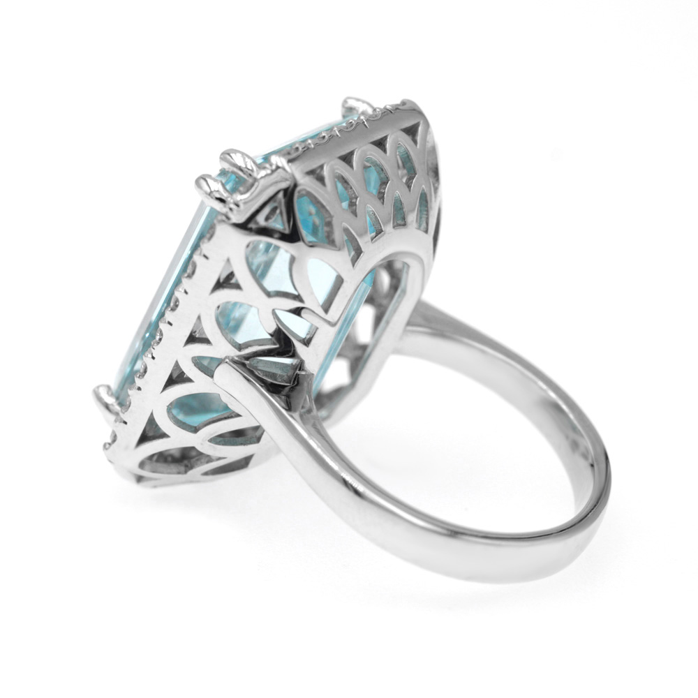 Anello in oro bianco 18K con acquamarina taglio smeraldo (22,30 ct) e diamanti taglio brillante (1,66 ct)