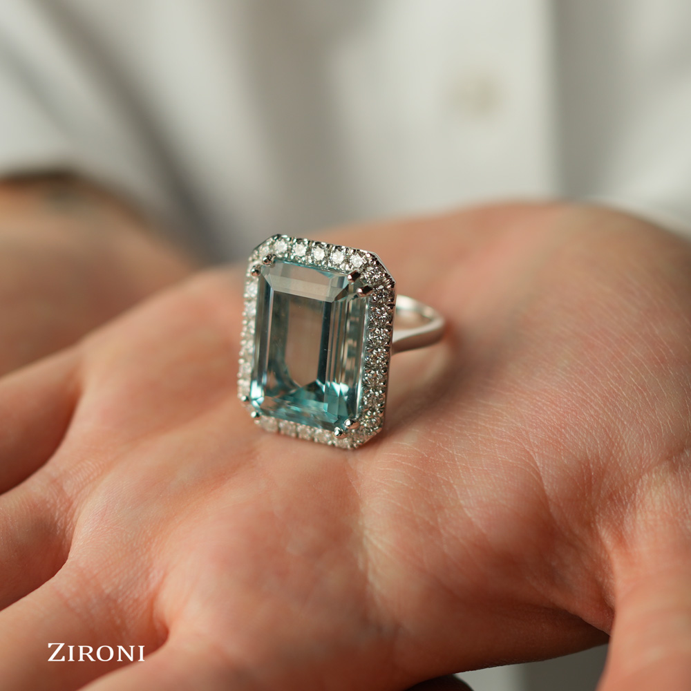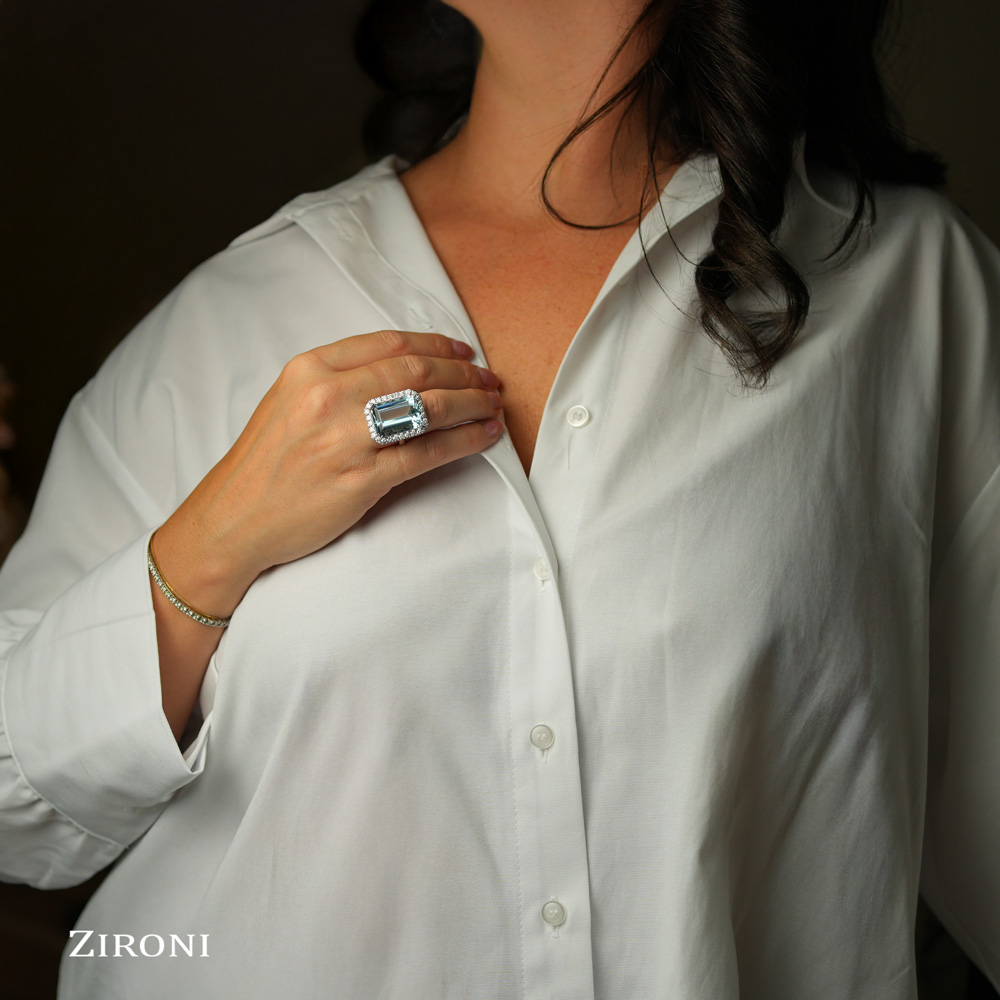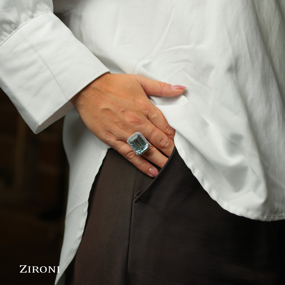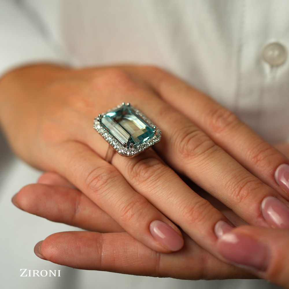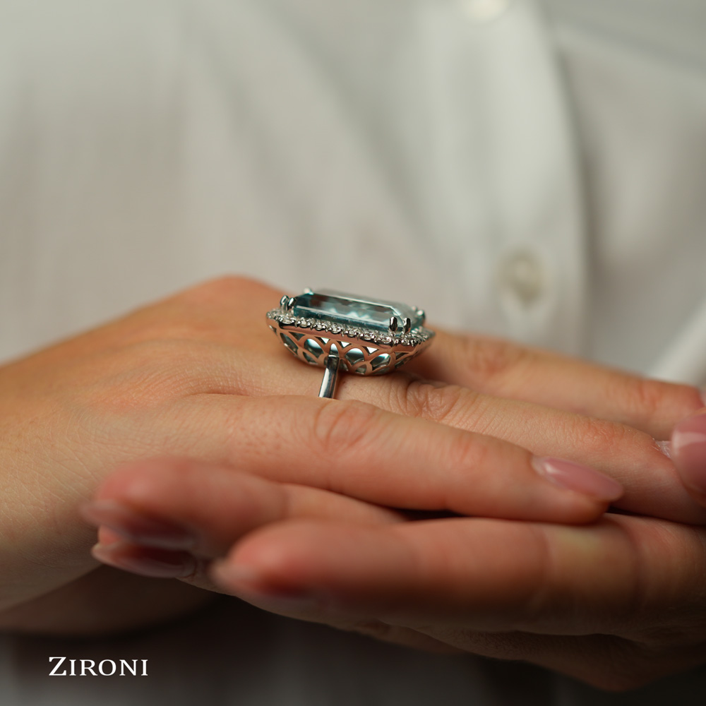 Anello in oro bianco 18K con acquamarina taglio smeraldo (22,30 ct) e diamanti taglio brillante (1,66 ct)