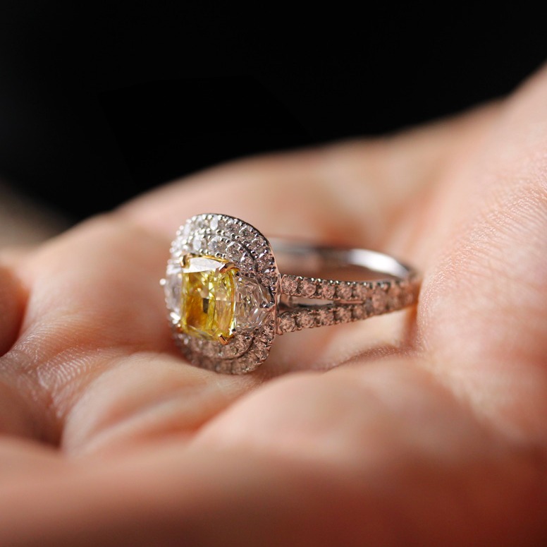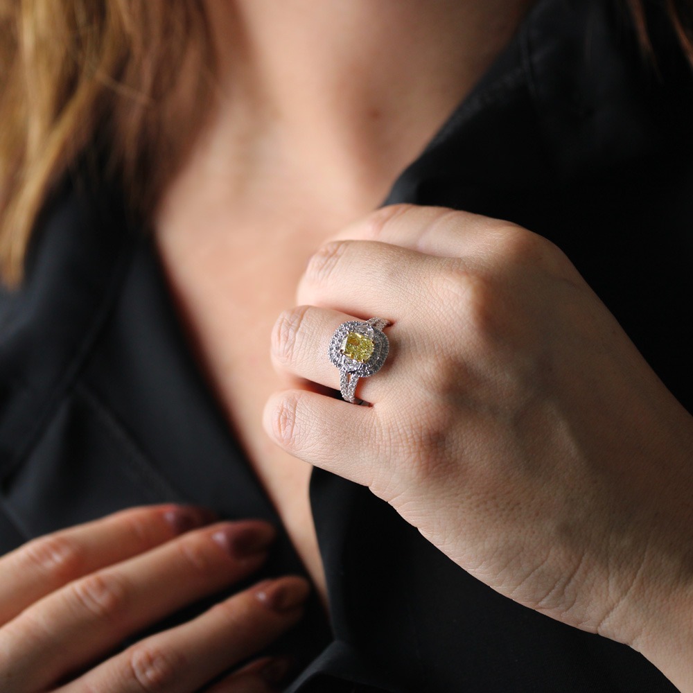 Anello in oro bianco 18K con 56 diamanti taglio brillante (ct 0,95 - F - VS), 2 diamanti taglio scudo (ct 0,42 - F - VS) e diamante fancy yellow taglio cuscino (ct 1,51 - VS1)