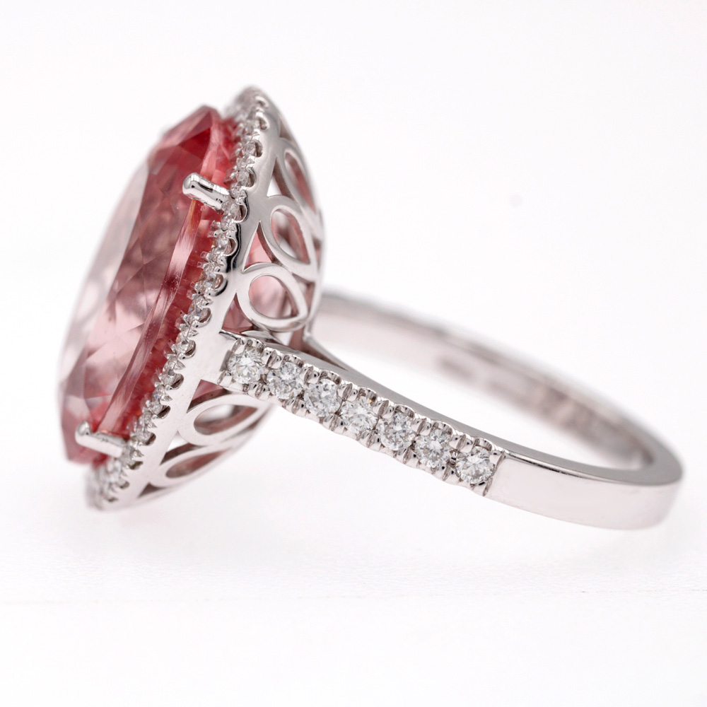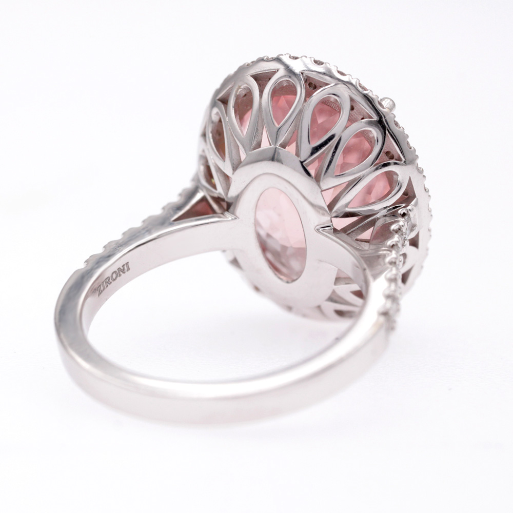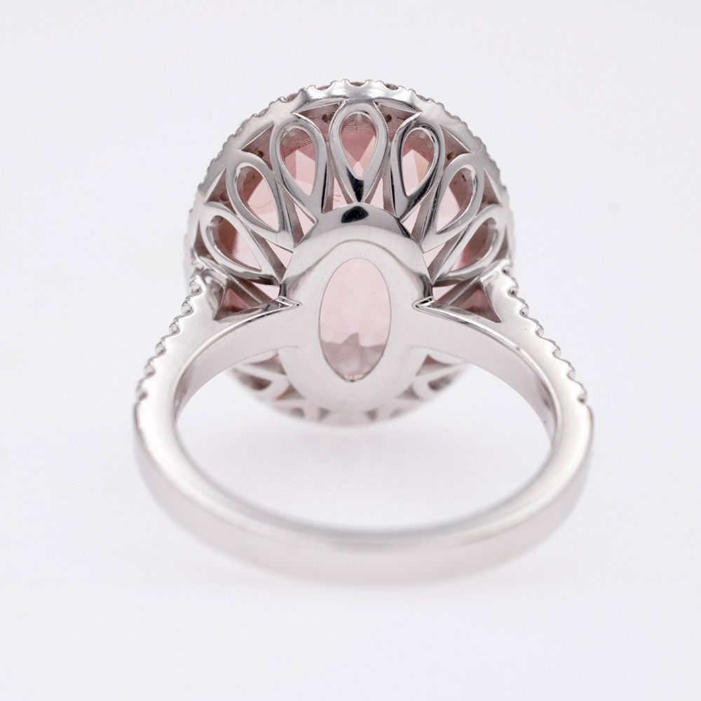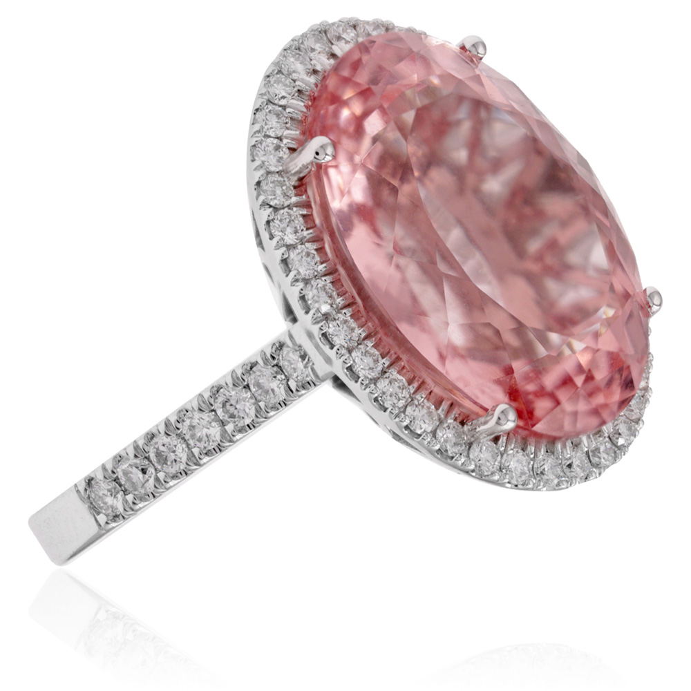 Anello in oro rosa con morganite (ct 10,65) taglio ovale e diamanti taglio brillante (ct 0,61 - G - VS)