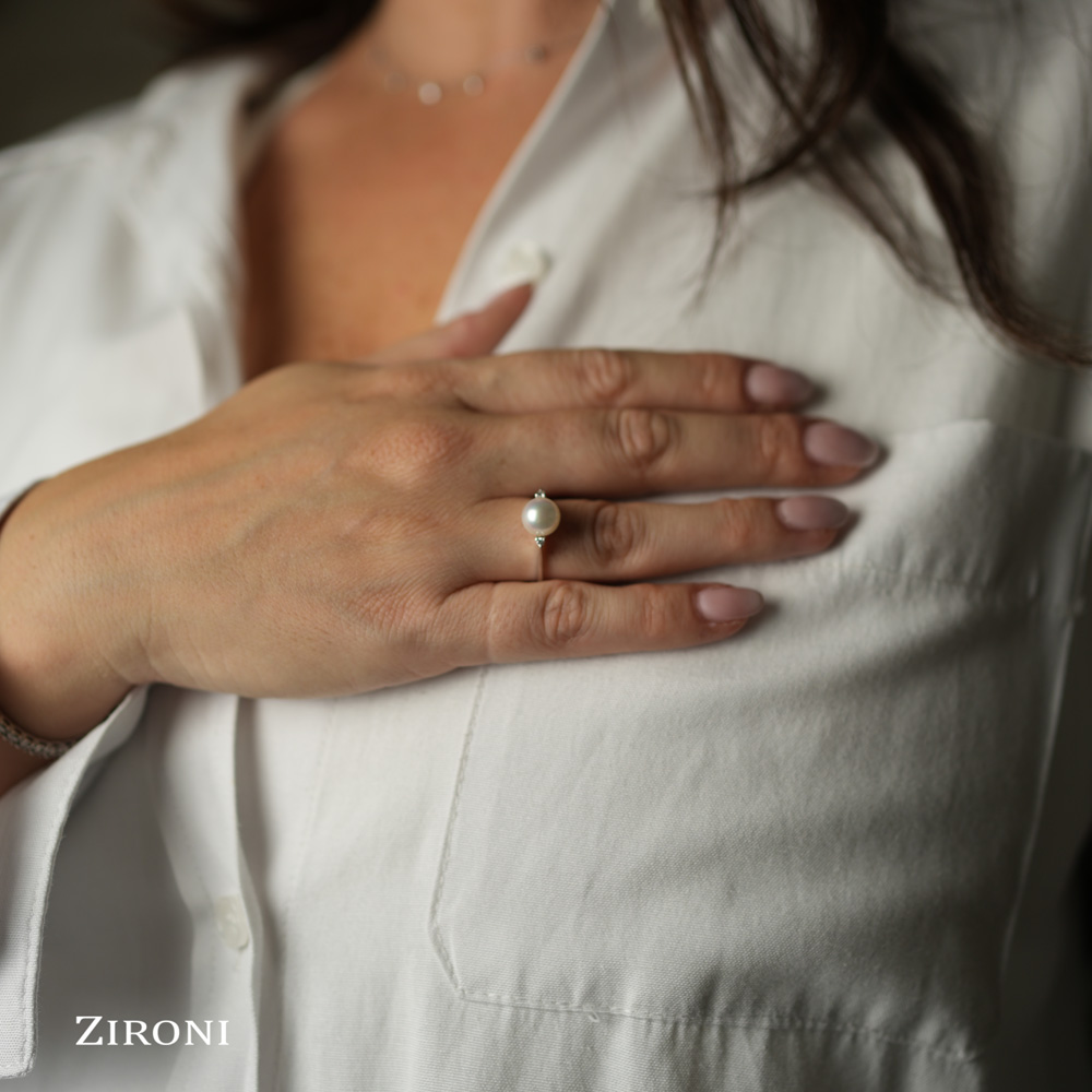 Anello in oro bianco 18K con perla Akoya (8/8,5) e 2 diamanti taglio brillante (ct 0,04)