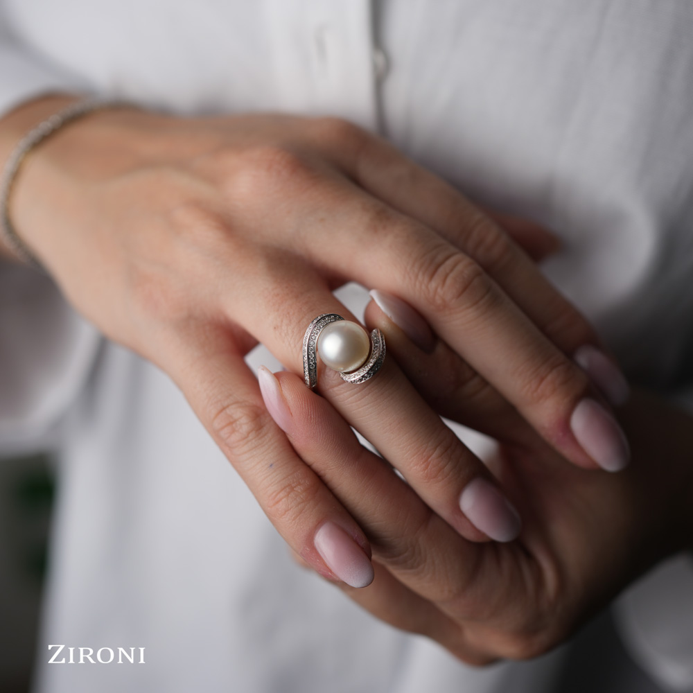 Anello in oro bianco 18K con perla australiana (10 mm) e diamanti taglio brillante (ct 0,36)