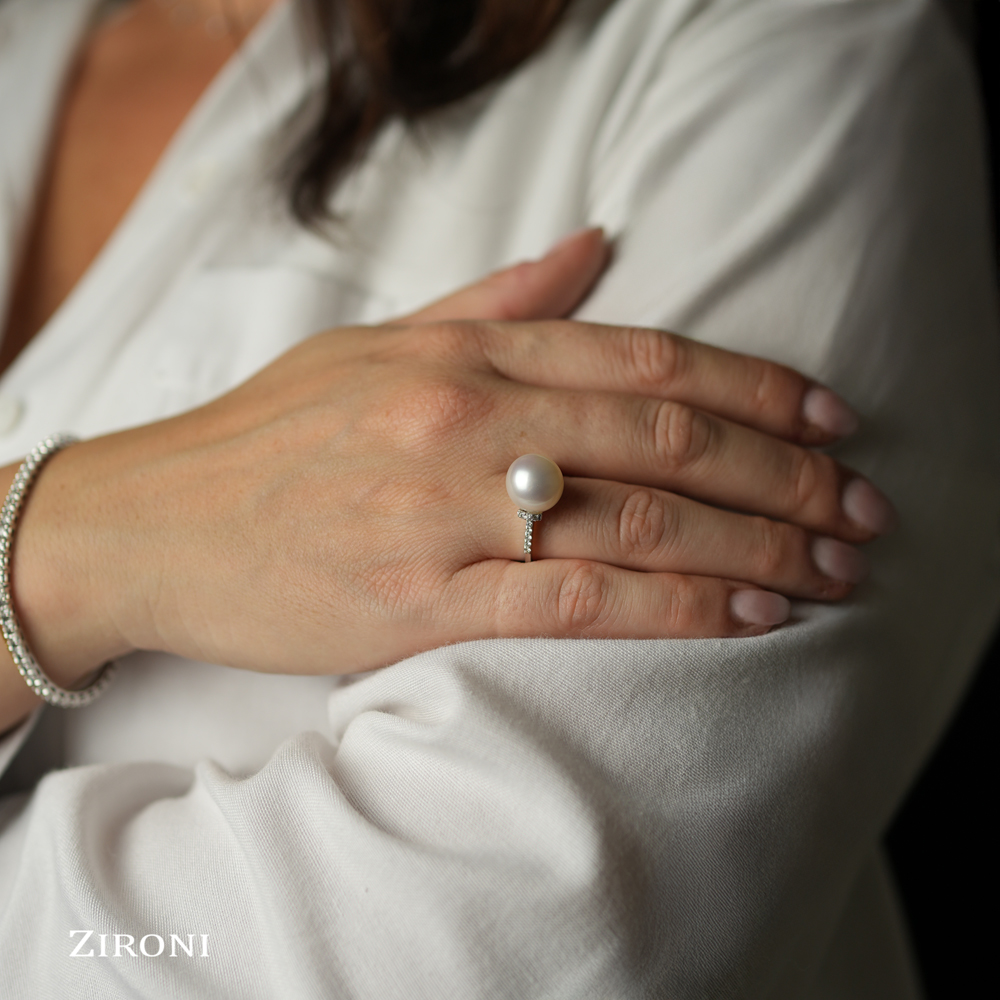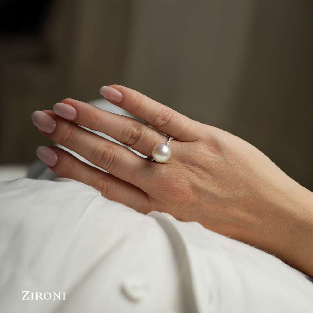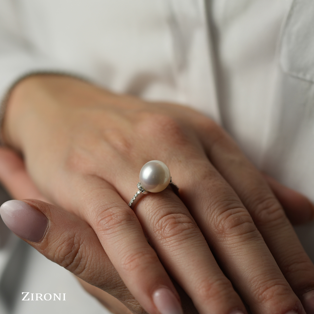 Anello in oro bianco 18K con perla australiana (11 mm) e diamanti taglio brillante (ct. 0,15)