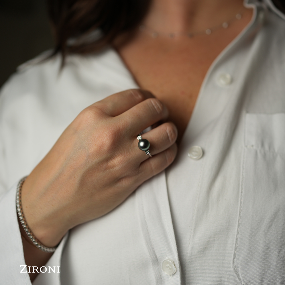 Anello in oro bianco con perla Tahiti (8,5/9) e diamanti (0,04 ct)