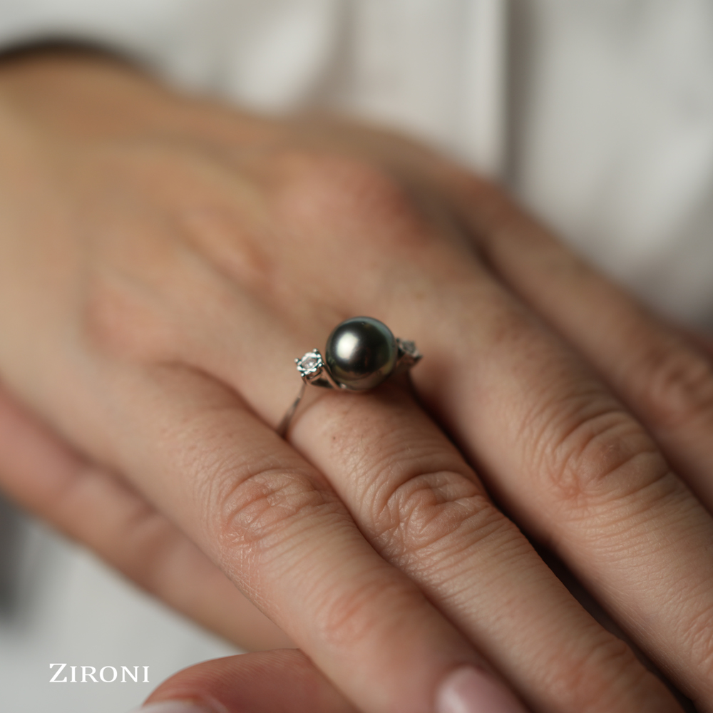 Anello in oro bianco 18K con perla Tahiti (8,5/9) e 2 diamanti taglio brillante (0,04 ct)