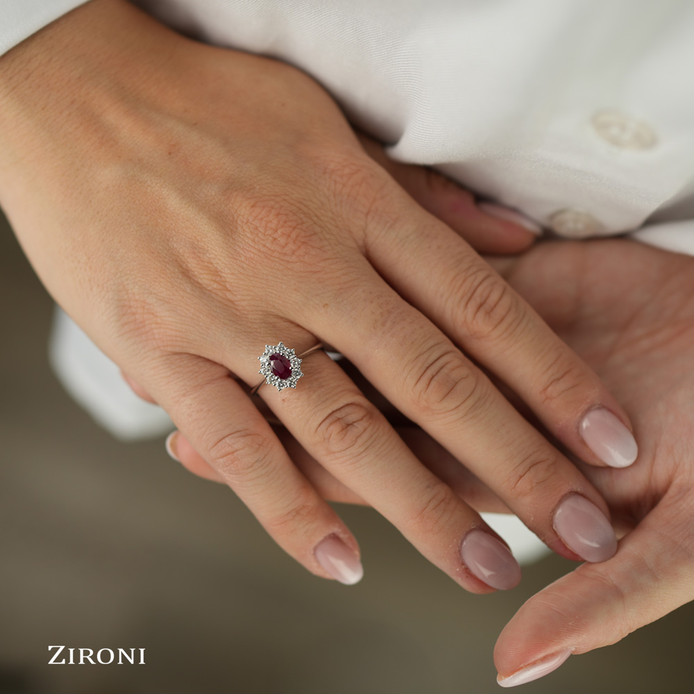 Anello in oro bianco 18K con rubino taglio ovale (0,53 ct) e diamanti taglio brillante (0,33 ct - D/E - SI) - misura rubino 6x8