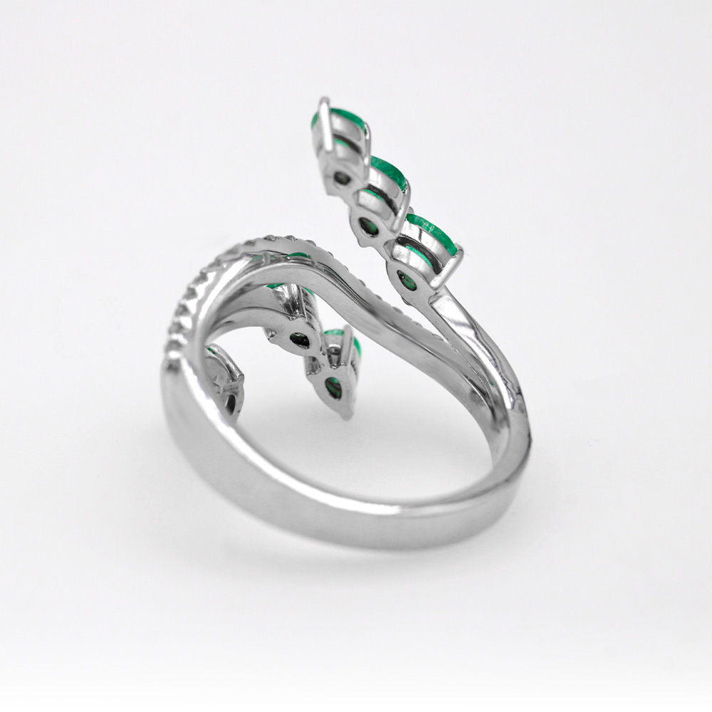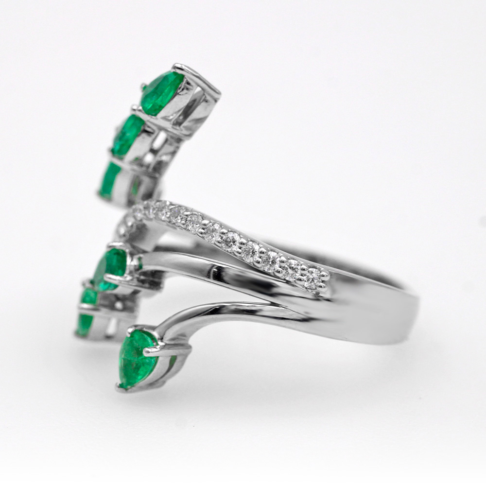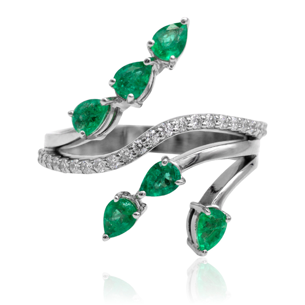 Anello in oro bianco 18K con smeraldi taglio goccia (ct 0,81) e diamanti taglio brillante (ct 0,24 - G - VS2)
