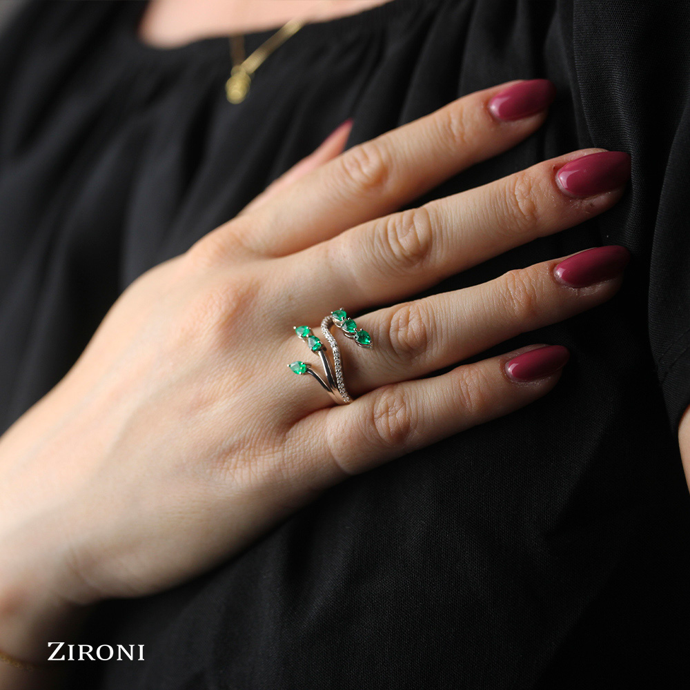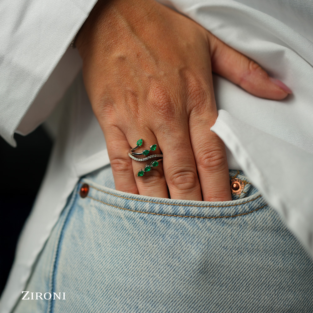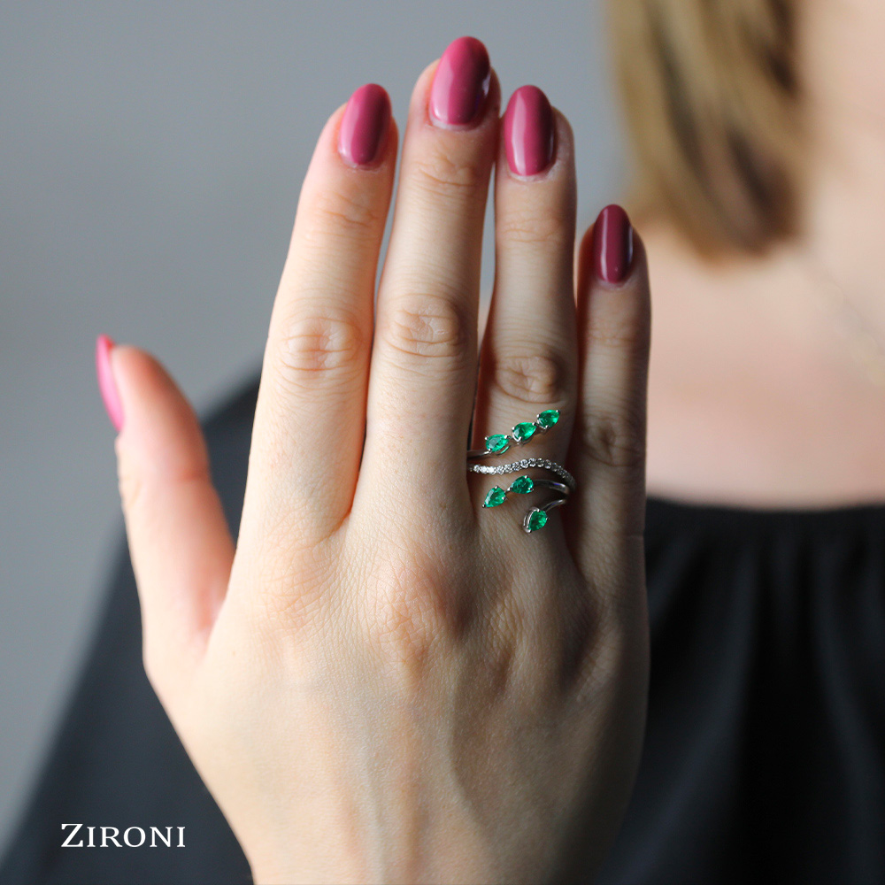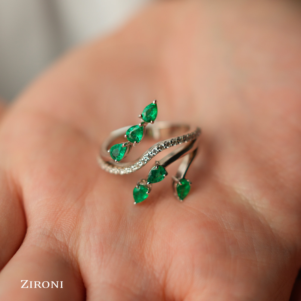 Anello in oro bianco 18K con smeraldi taglio goccia (ct 0,81) e diamanti taglio brillante (ct 0,24 - G - VS2)