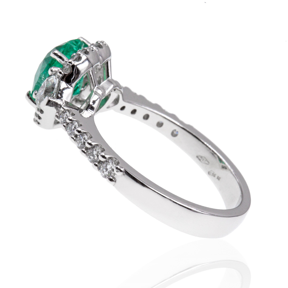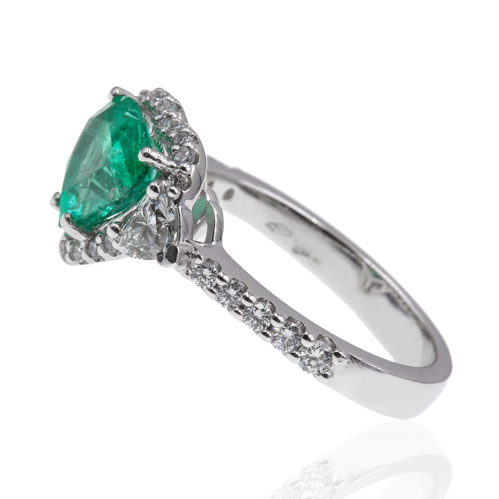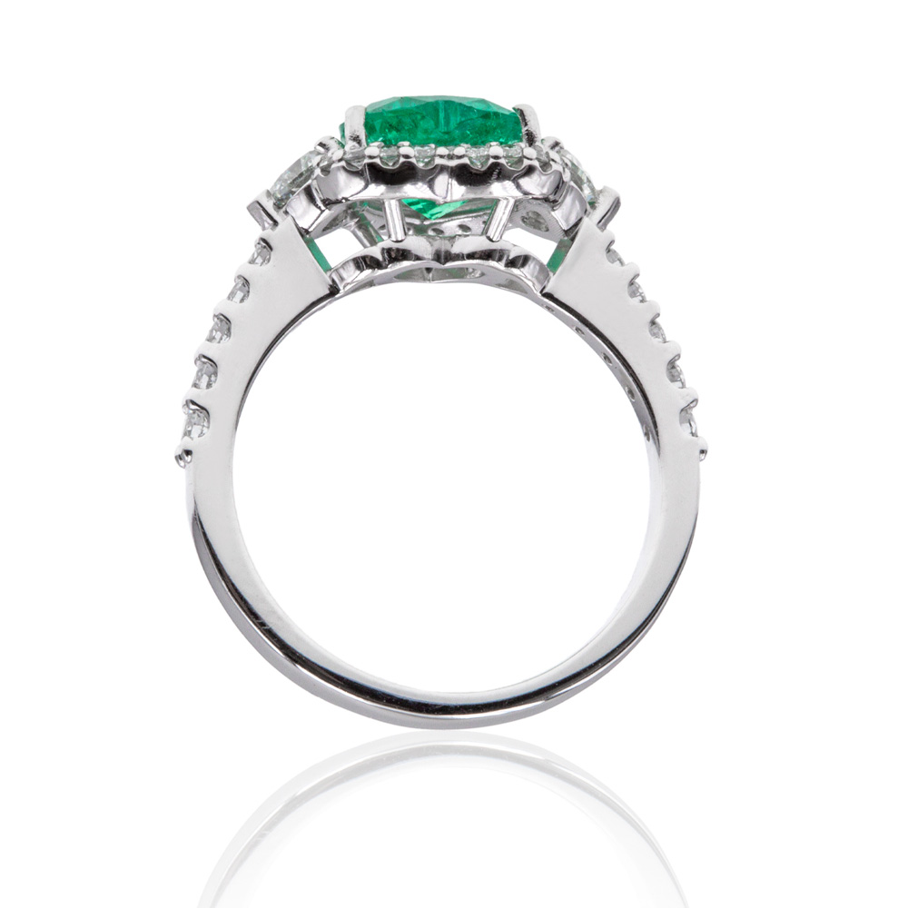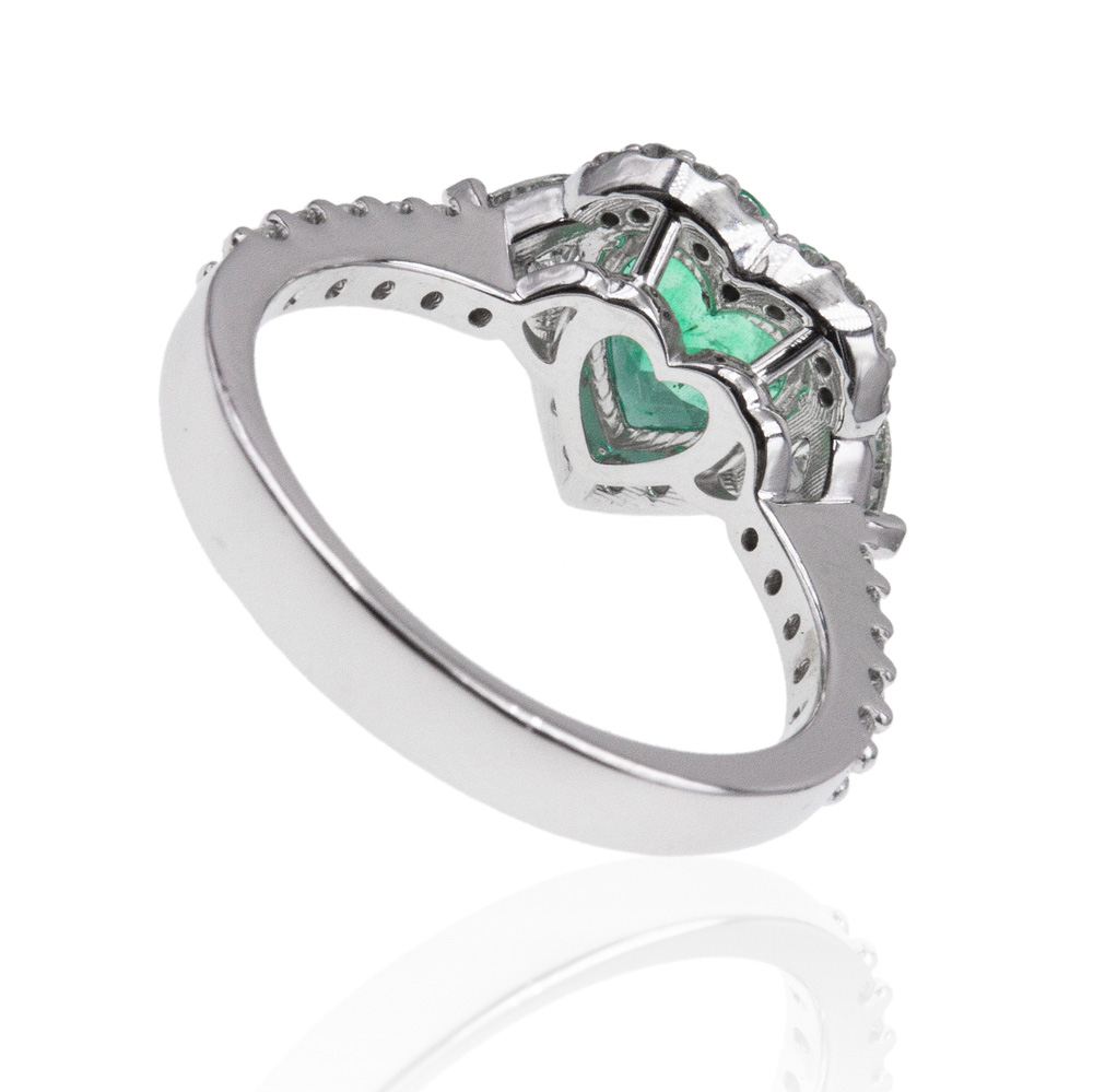Anello in oro bianco 18K con smeraldo taglio cuore (1,49 ct) e diamanti taglio brillante (0,76 ct - G - VS)