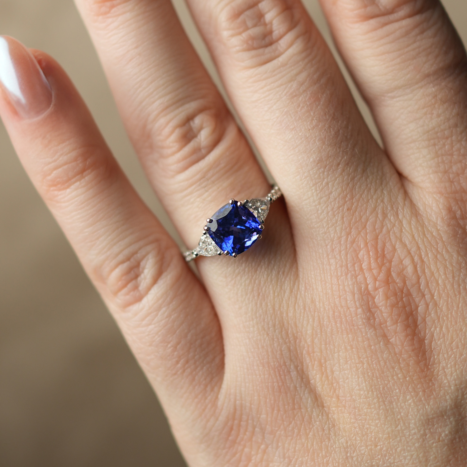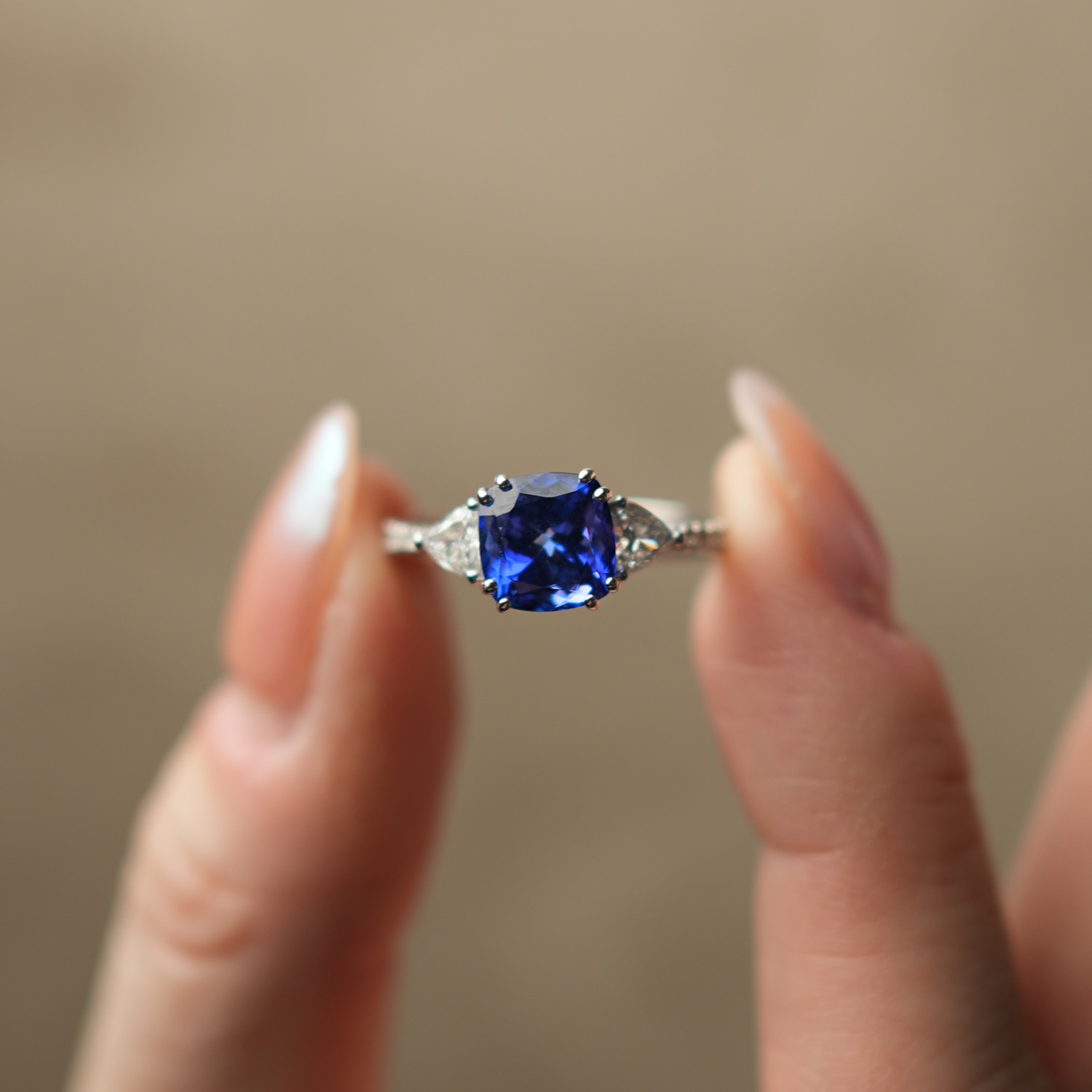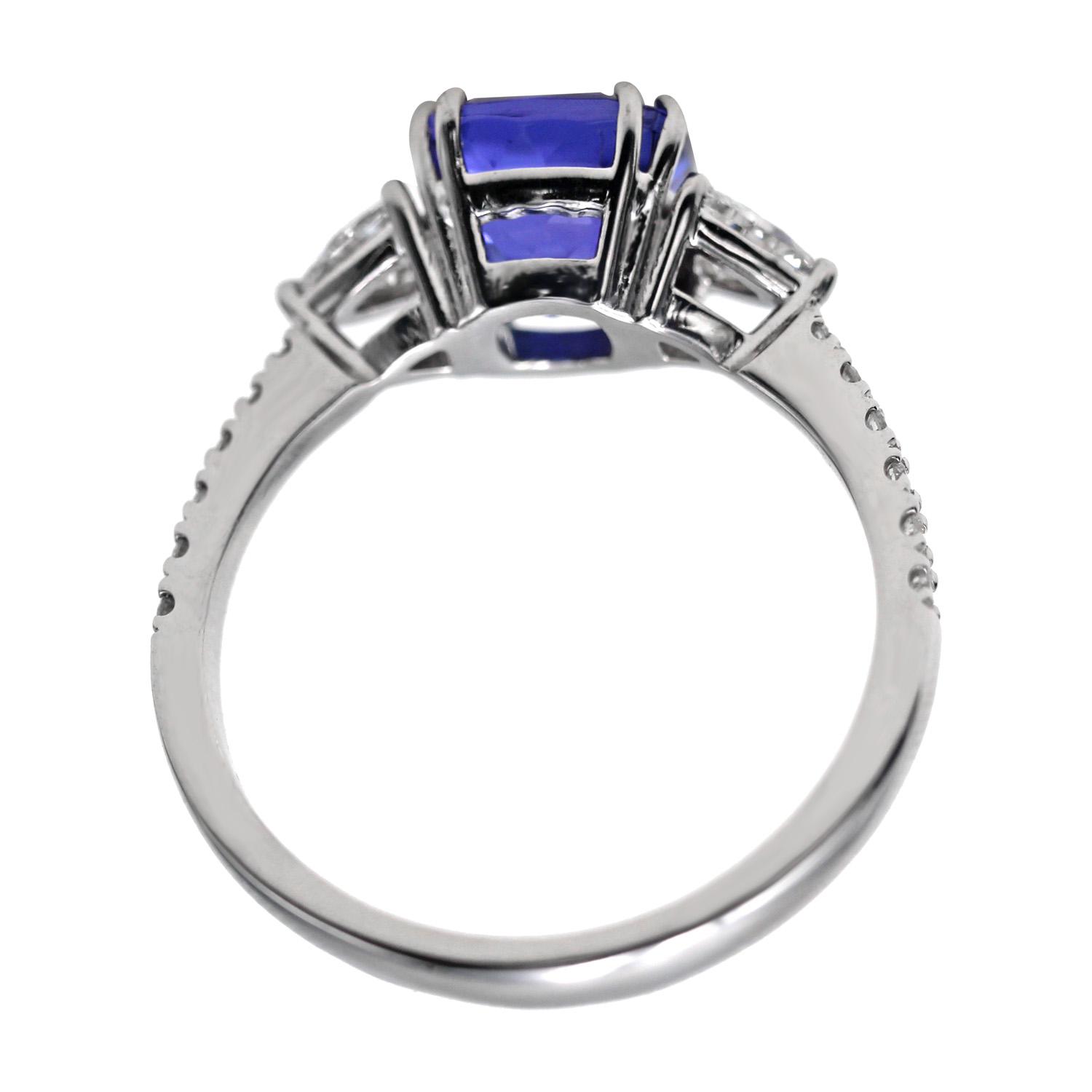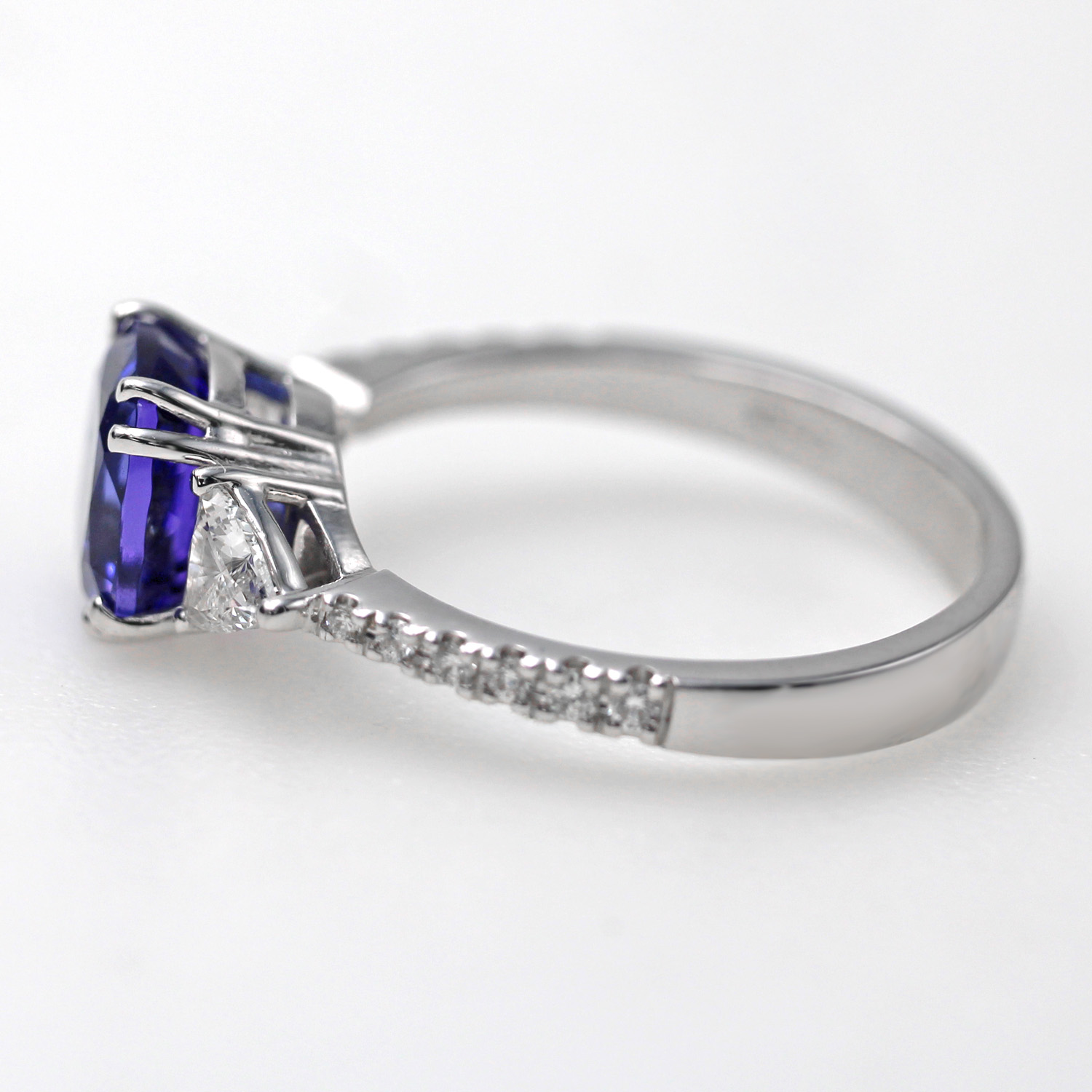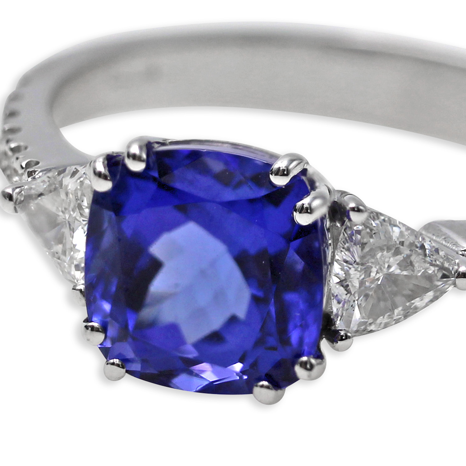 Anello in oro bianco 18K con tanzanite taglio cuscino (ct 2,29), diamanti taglio trillion (ct 0,33 - G - VS/SI) e diamanti taglio brillante (ct 0,08)