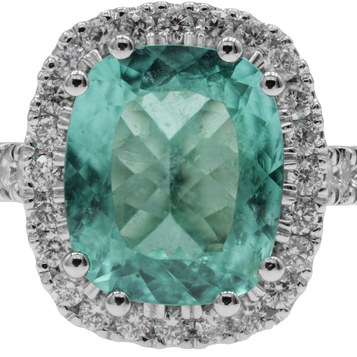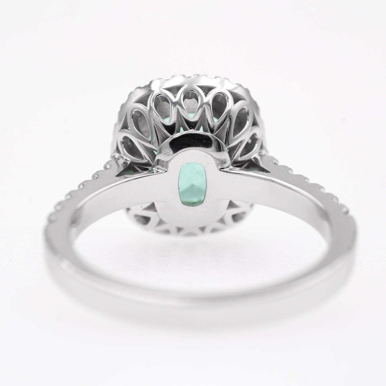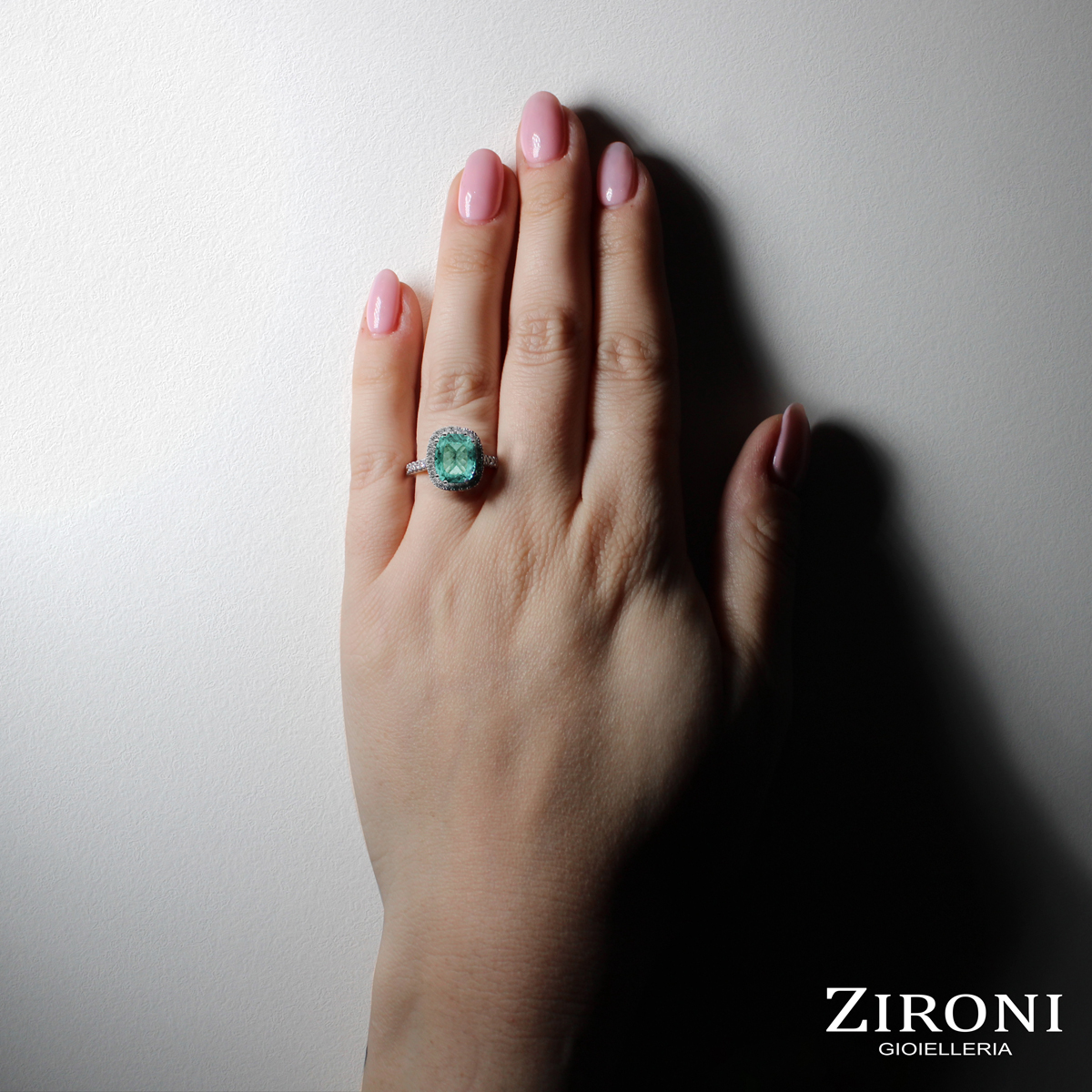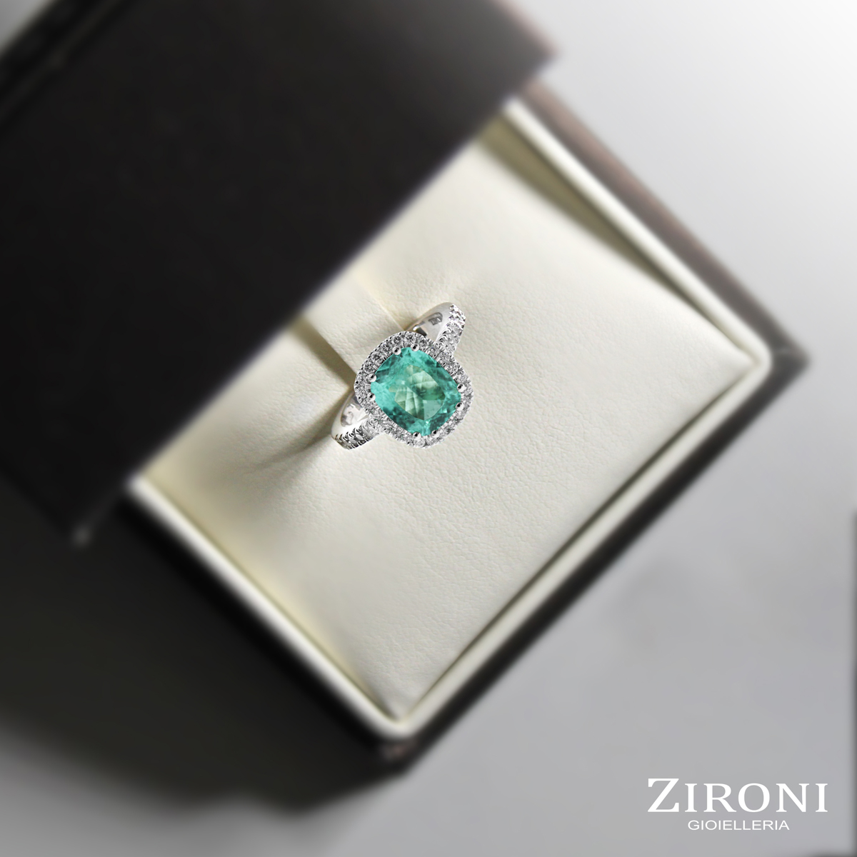 Anello in oro bianco con tormalina paraiba taglio cuscino (1,95 ct) e diamanti taglio brillante (0,48 ct)