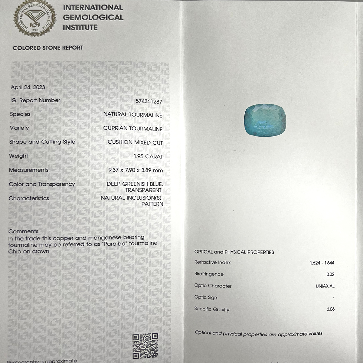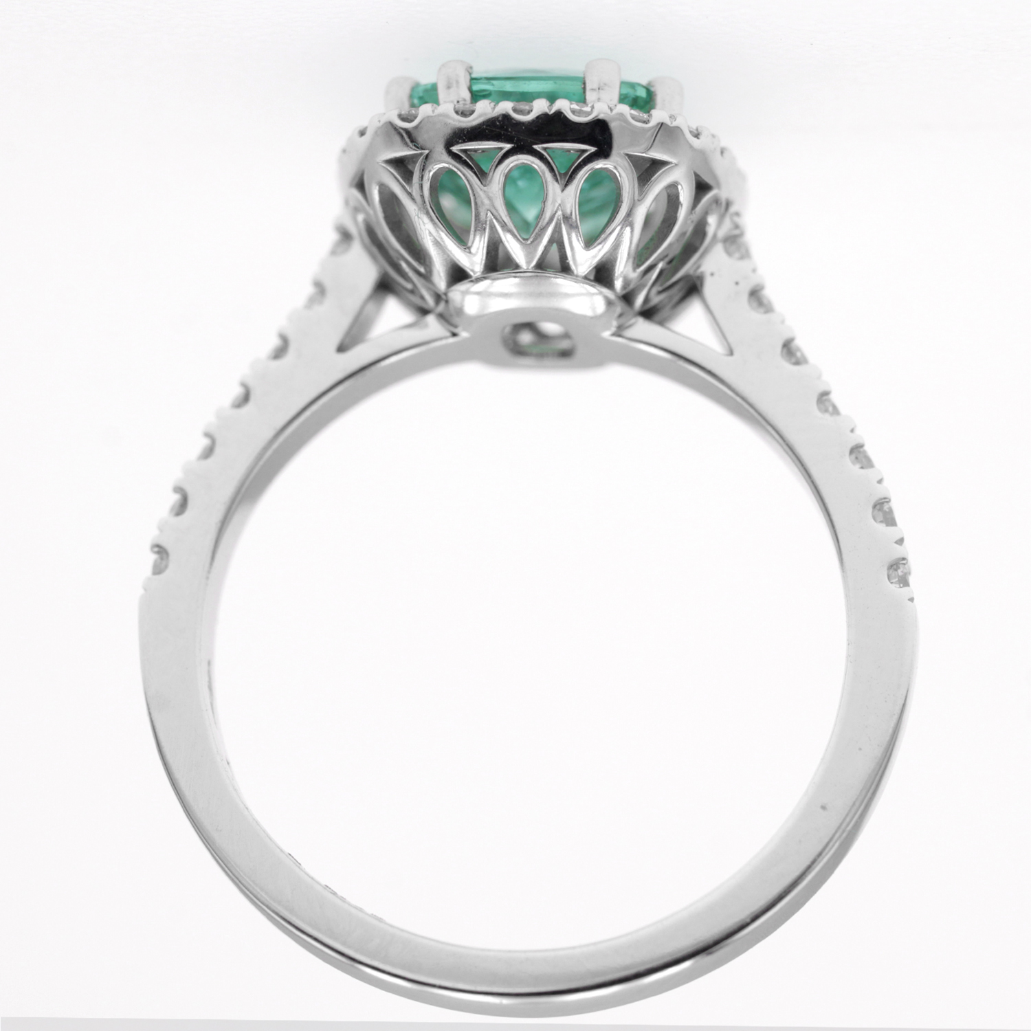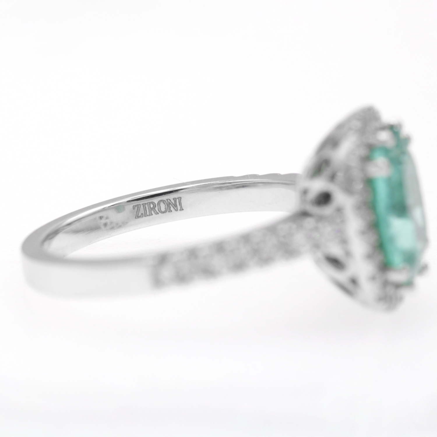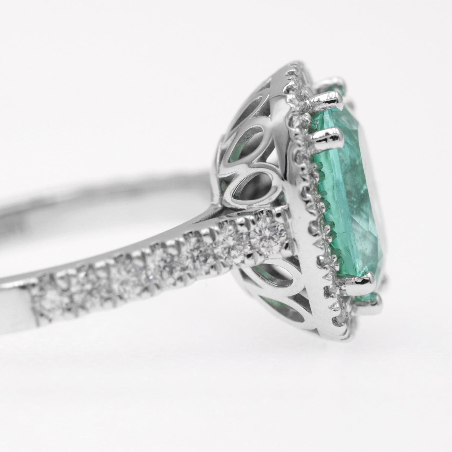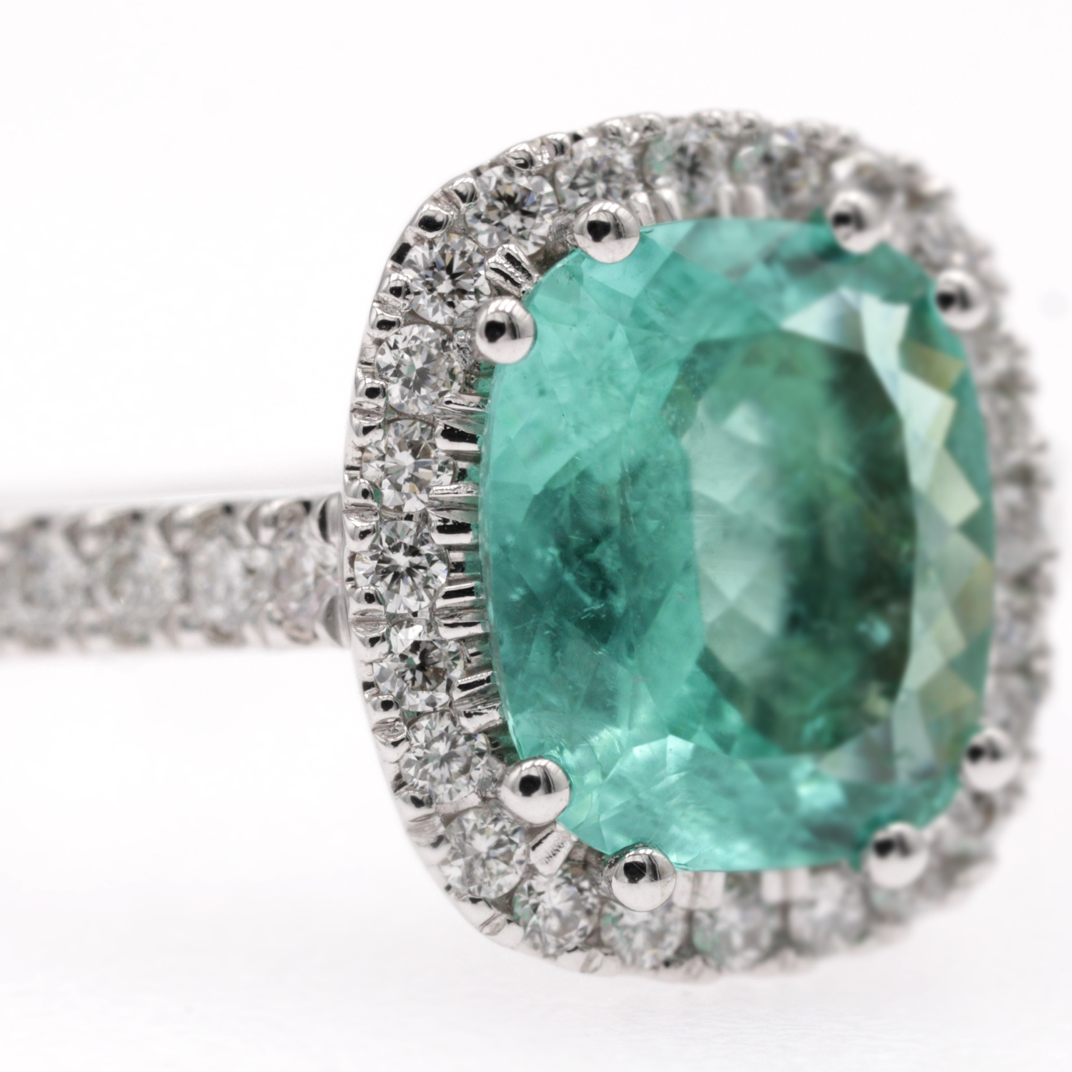 Anello in oro bianco con tormalina paraiba taglio cuscino (1,95 ct) e diamanti taglio brillante (0,48 ct)