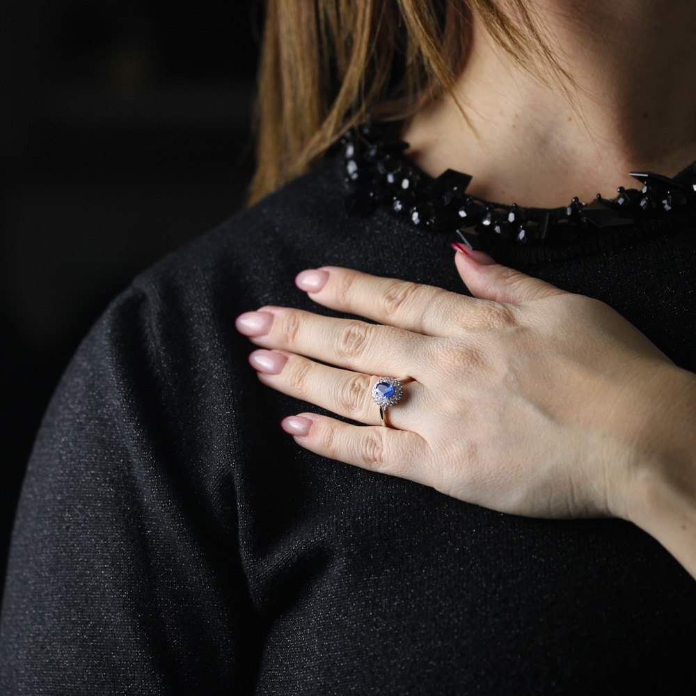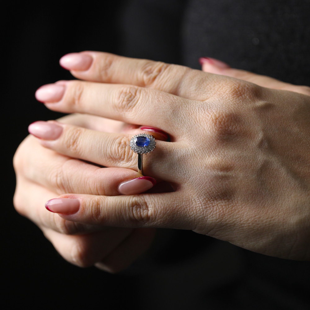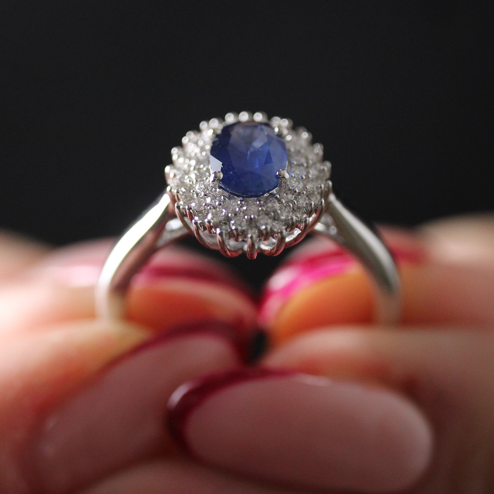 Anello in oro bianco 18K con zaffiro taglio ovale (1,11 ct) e doppio contorno di diamanti (0,25 ct - G/H - SI)