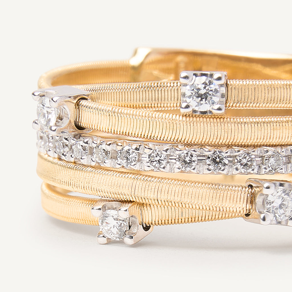 Anello a cinque fili con castoni e barretta di diamanti in oro giallo