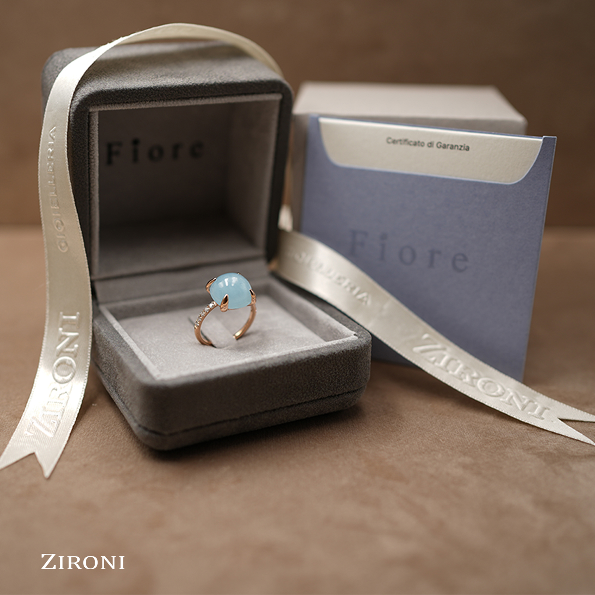 Anello in oro rosa 18K con acquamarina blu milky cabochon (ct 7,90) e diamanti taglio brillante (ct 0,17) - mod. grande