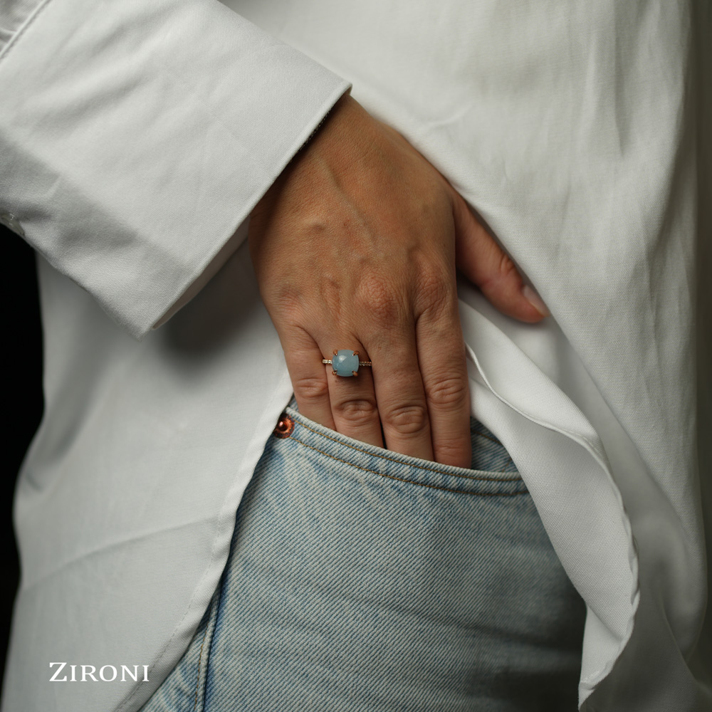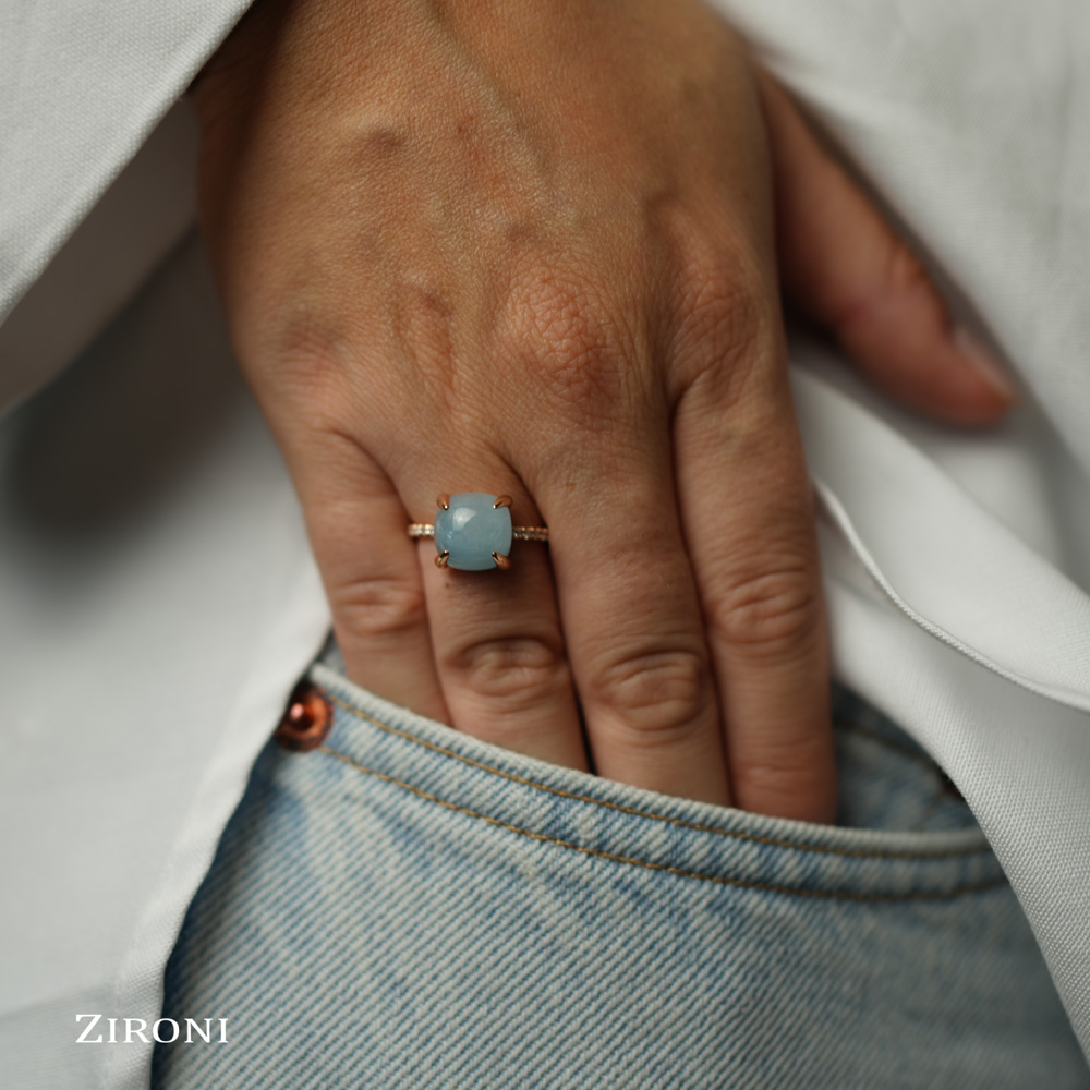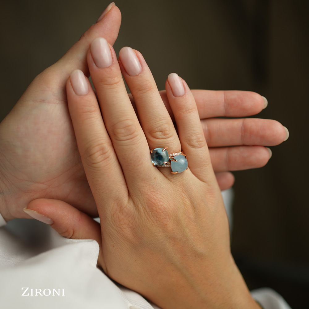 Anello in oro rosa 18K con acquamarina blu milky cabochon (ct 4,65) e diamanti taglio brillante (ct 0,10) - mod. medio