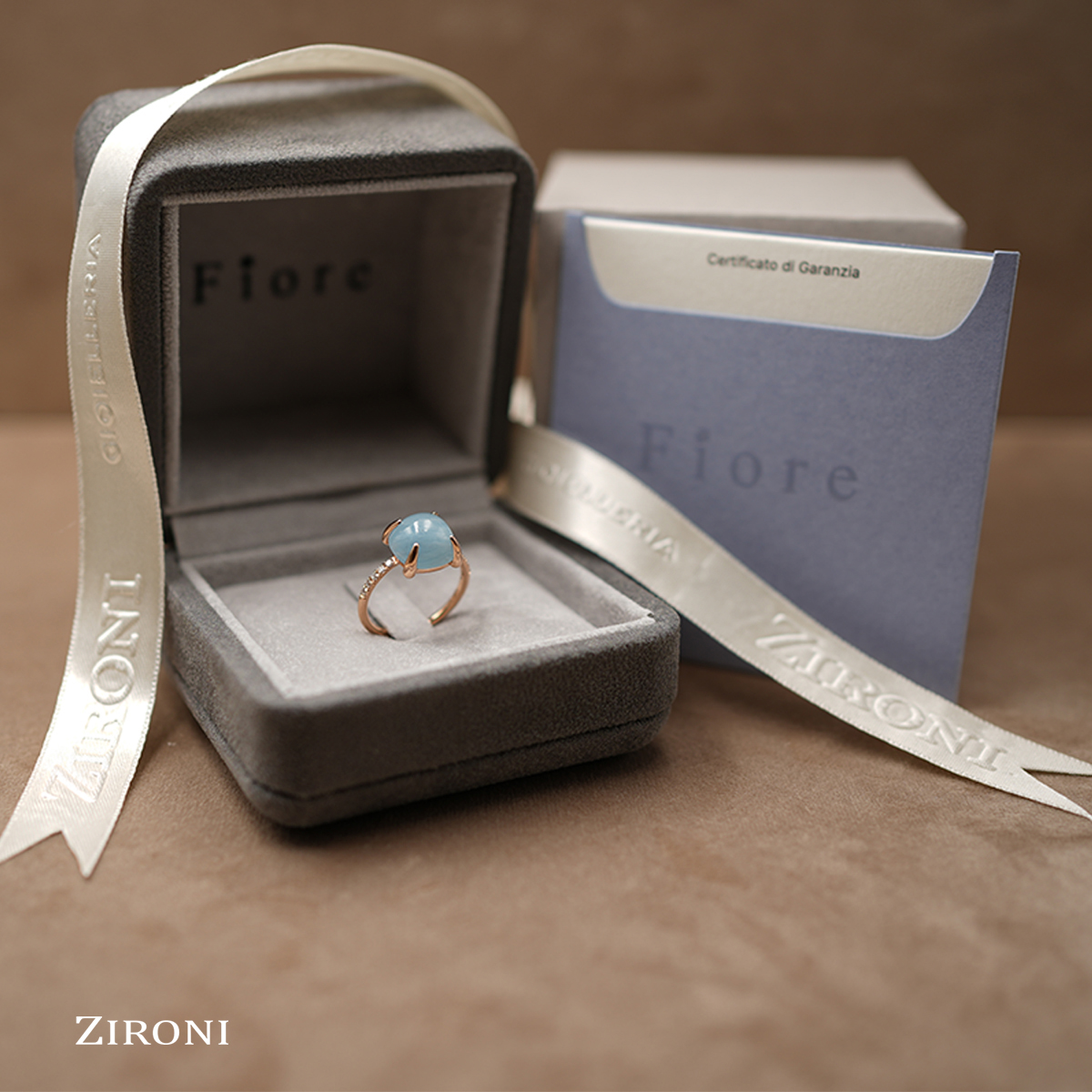 Anello in oro rosa con acquamarina blu milky e diamanti - mod. medio