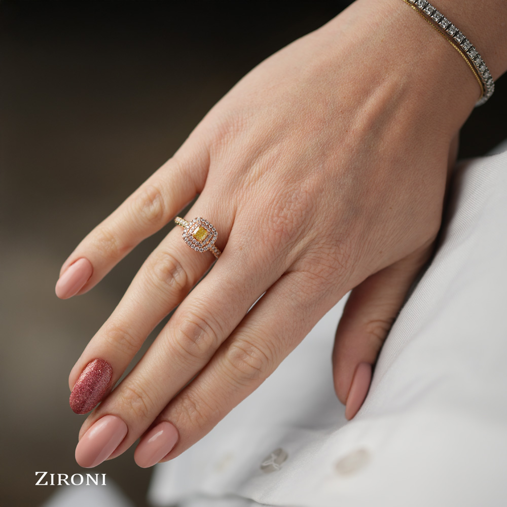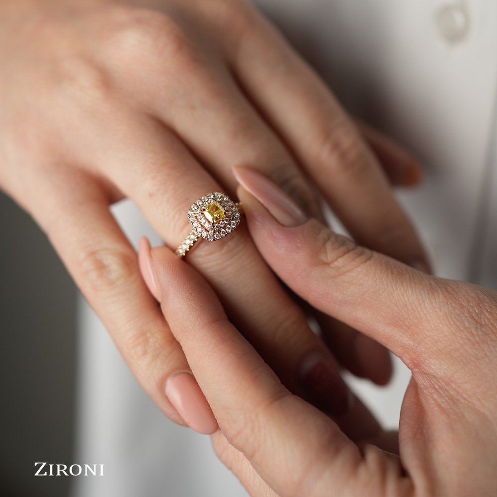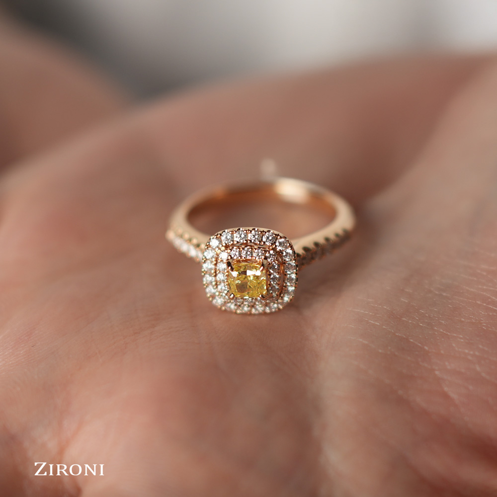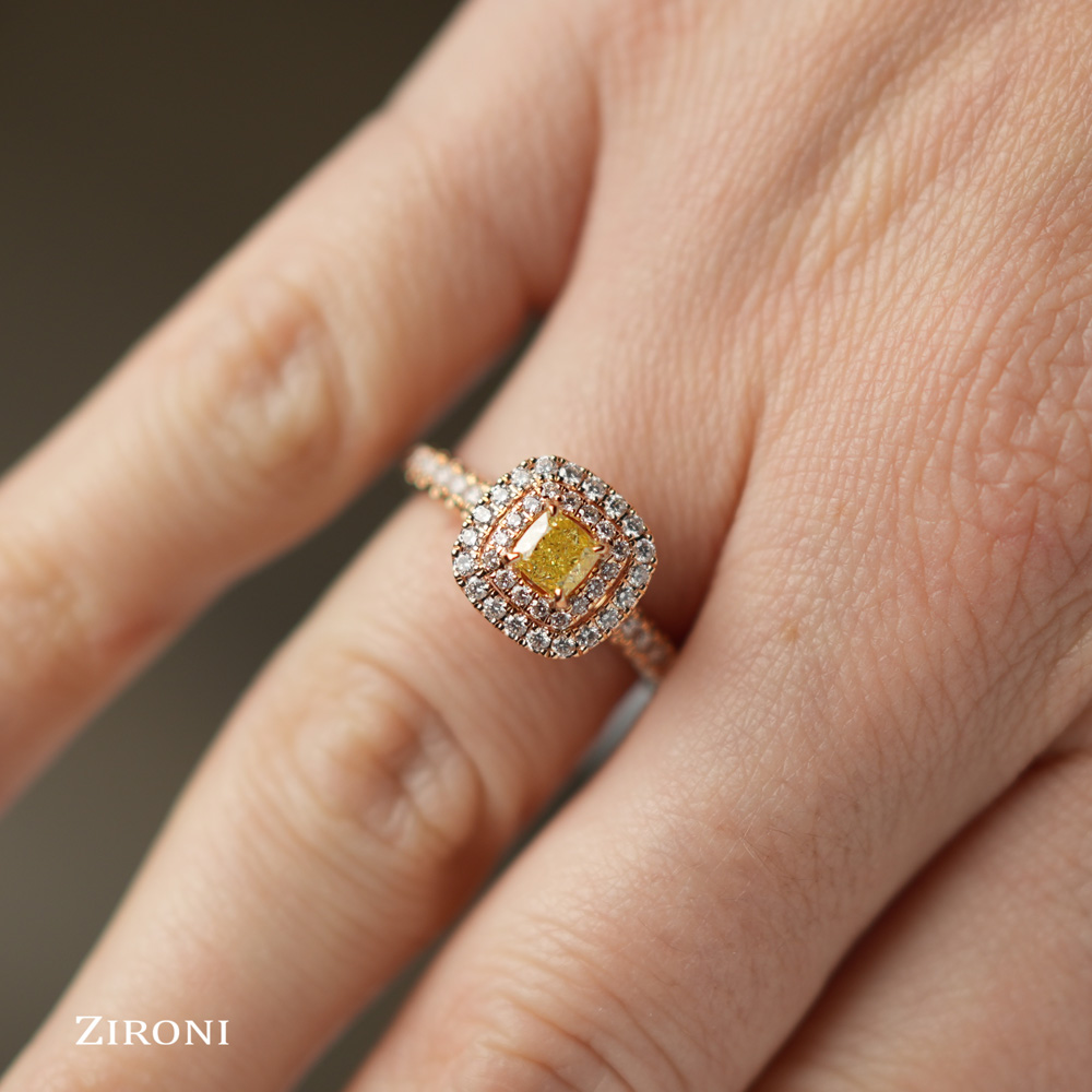 Anello in oro rosa 18K con diamanti taglio brillante a doppio contorno (ct 0,43 - G - SI) e diamante fancy giallo taglio cuscino (ct 0,36)