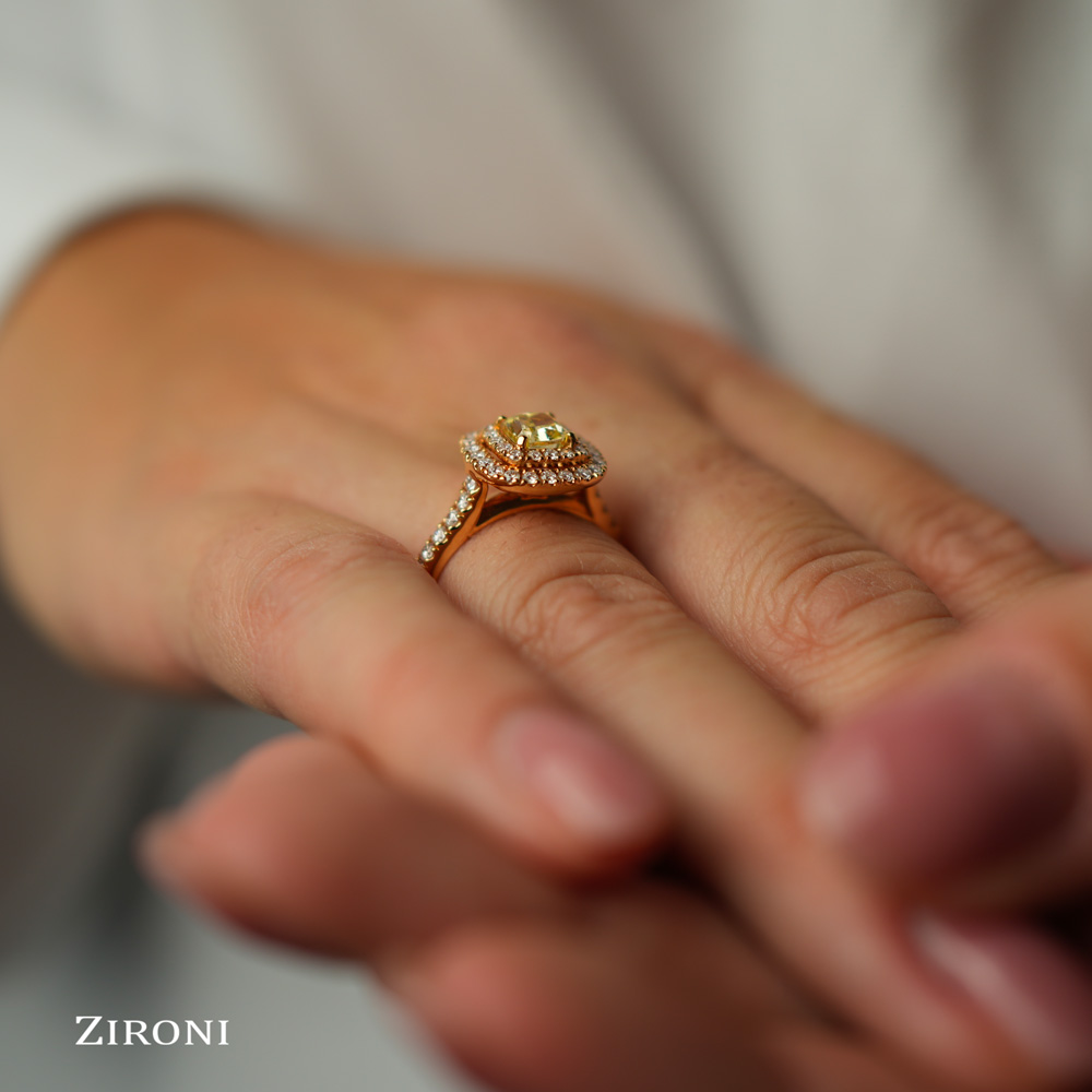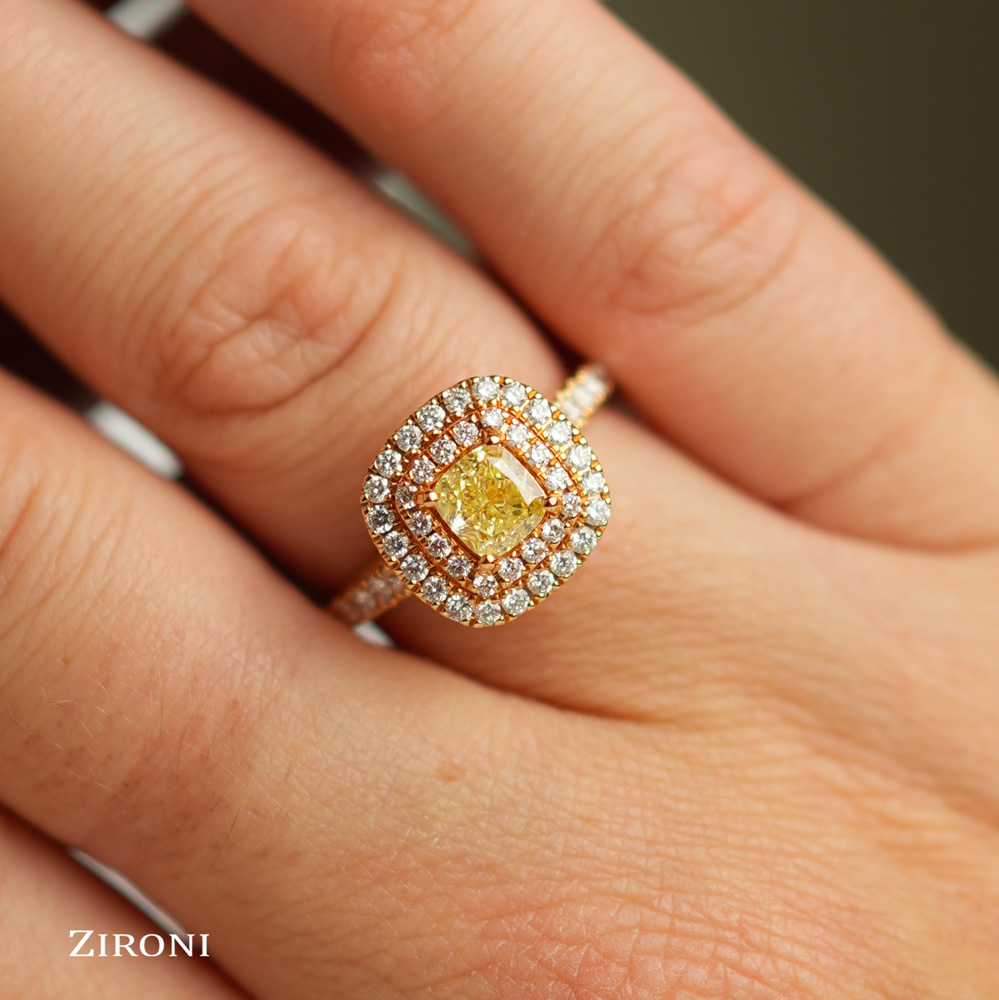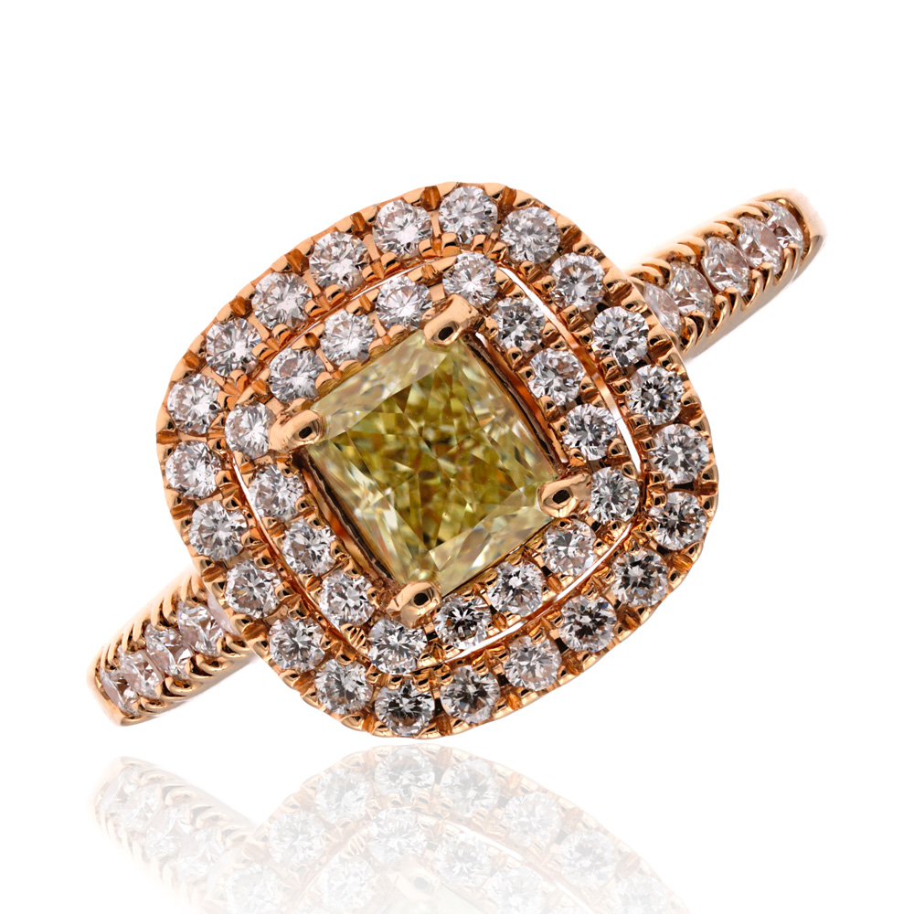 Anello in oro rosa con diamante fancy naturale giallo taglio principessa (ct 0,71 - VS) e diamanti taglio brillante (ct 0,54 - G - VS)