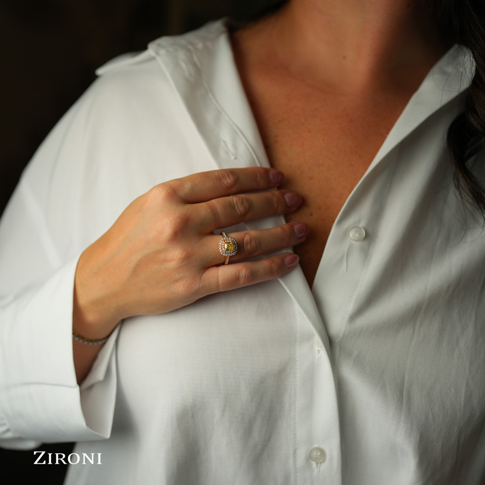 Un diamante fancy yellow è un diamante naturale che presenta una colorazione gialla intensa e brillante, dovuta alla presenza di azoto all’interno della sua struttura cristallina.