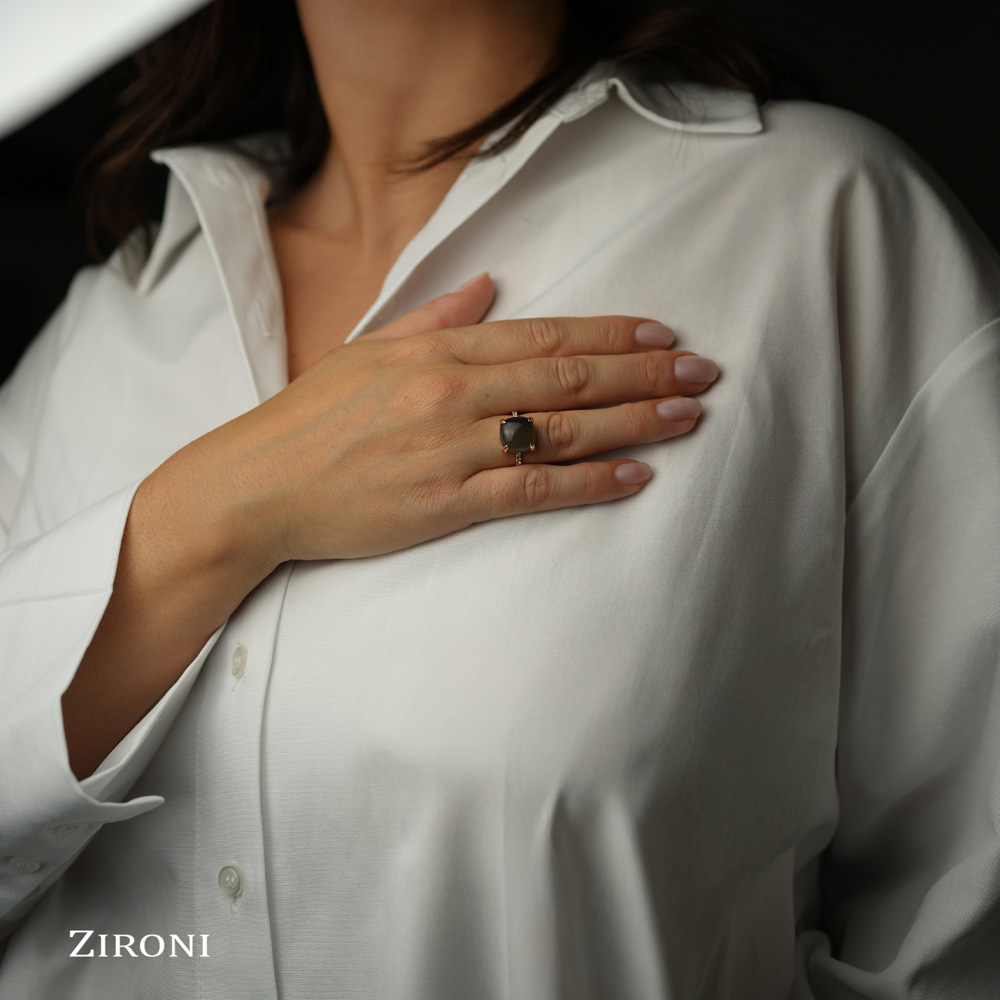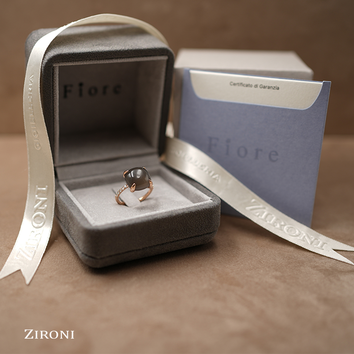 Anello in oro rosa 18K con pietra di luna grigia cabochon (ct 7,50) e diamanti taglio brillante (ct 0,17) - mod. grande