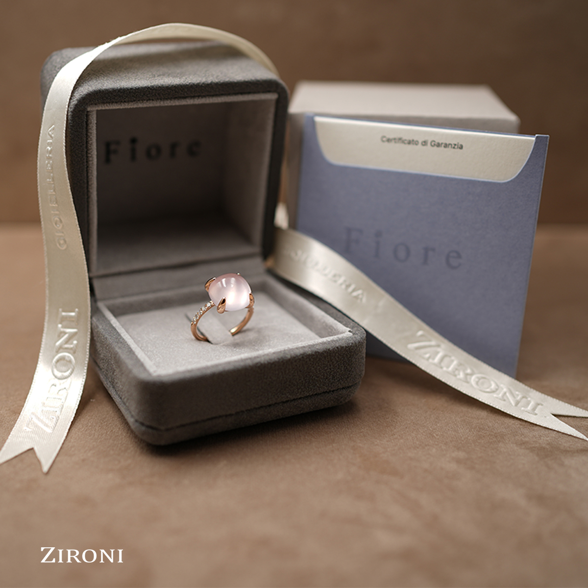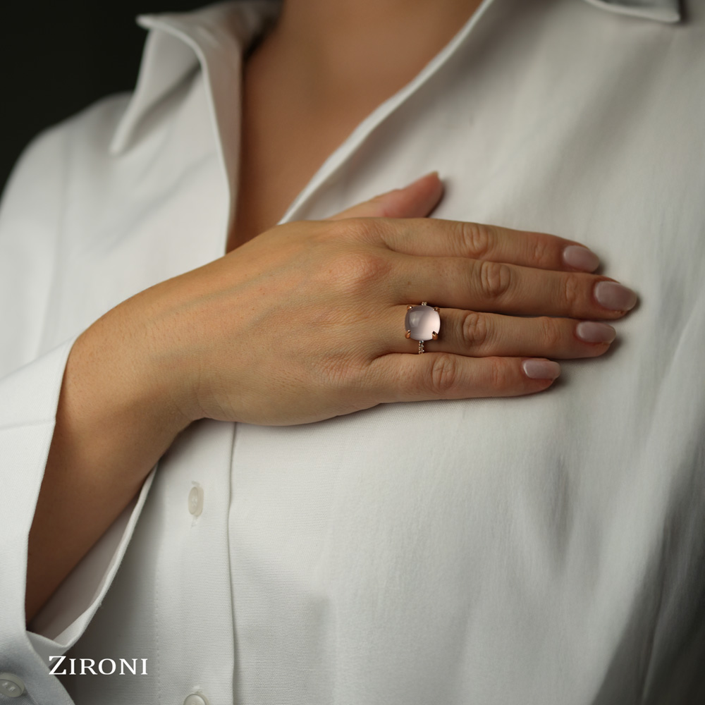 Anello in oro rosa 18K con quarzo rosa cabochon (ct 7,80) e diamanti taglio brillante (ct 0,17) - mod. grande