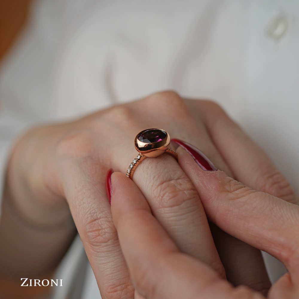 Anello in oro rosa 18K con rodolite taglio ovale briolette (3,06 ct) e 12 diamanti taglio brillante (0,21 ct) - mod. medio