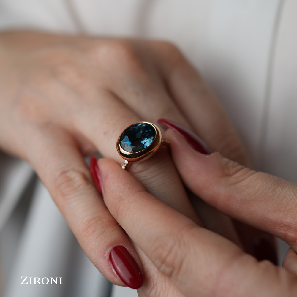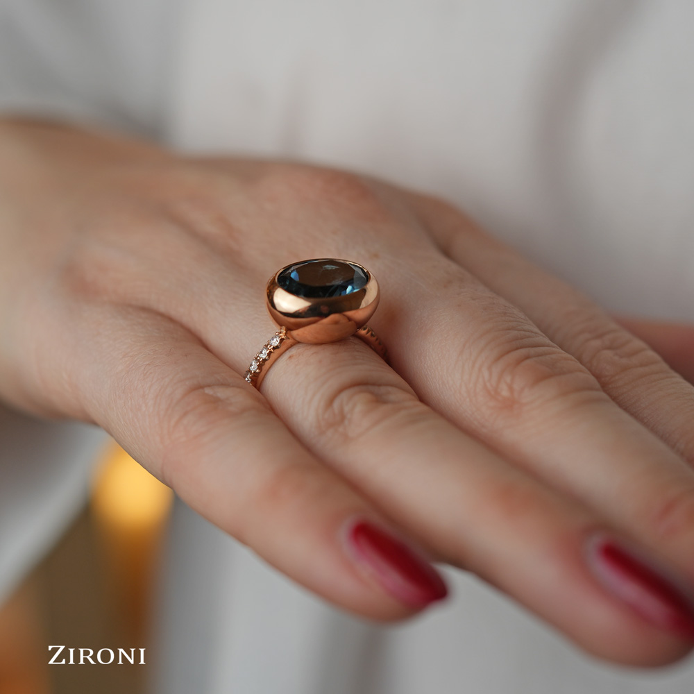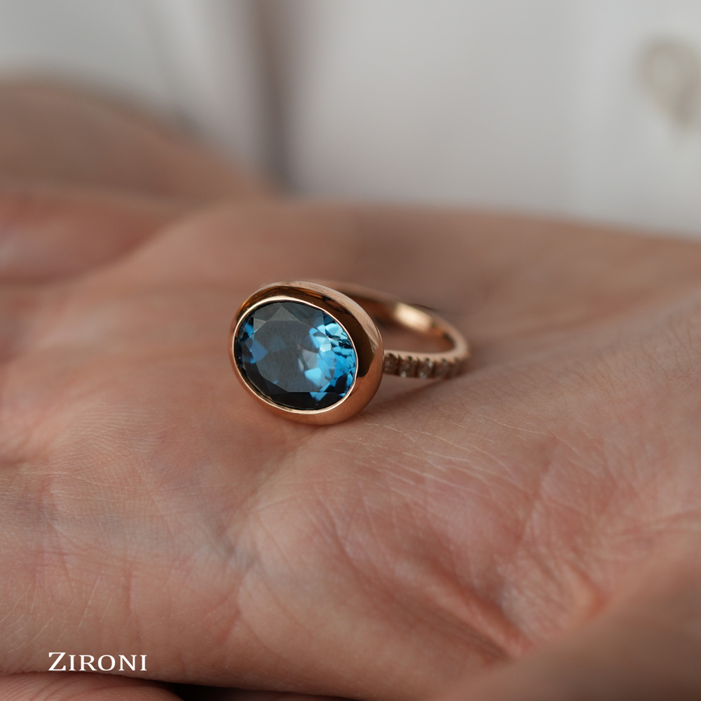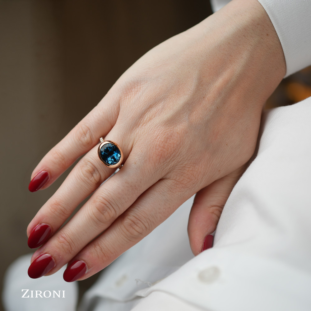 Anello in oro rosa 18K con topazio blu london taglio ovale brioelette (5,77 ct) e 12 diamanti taglio brillante (0,23 ct - G/H - VS) - mod. grande