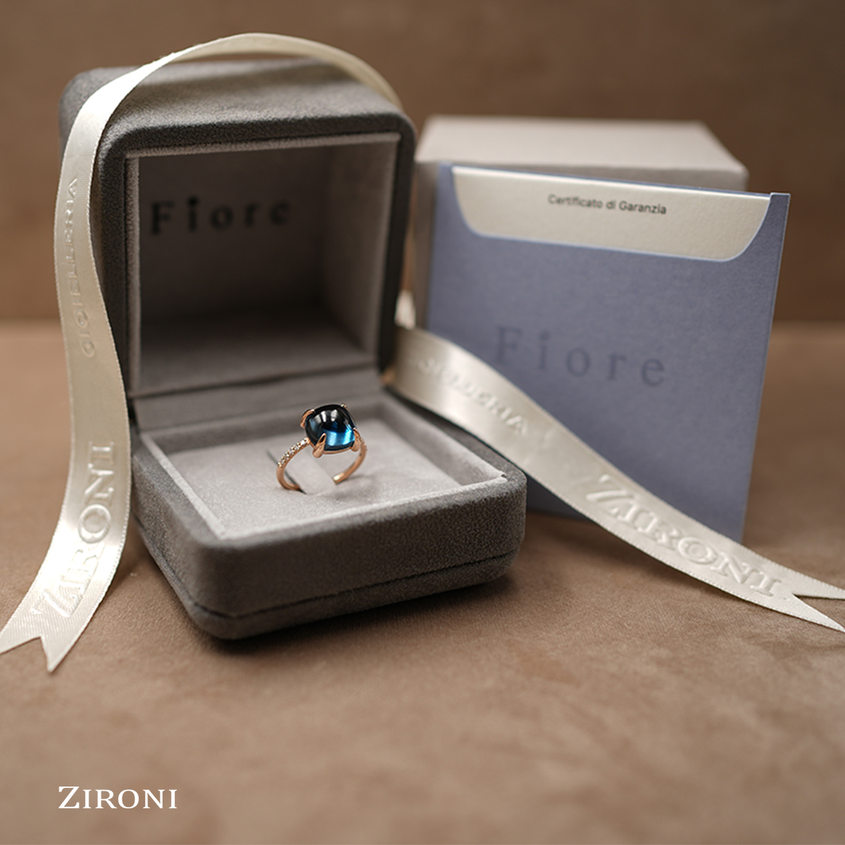 Anello in oro rosa 18K con topazio blu london cabochon (ct 6,20) e diamanti taglio brillante (ct 0,10) - mod. medio