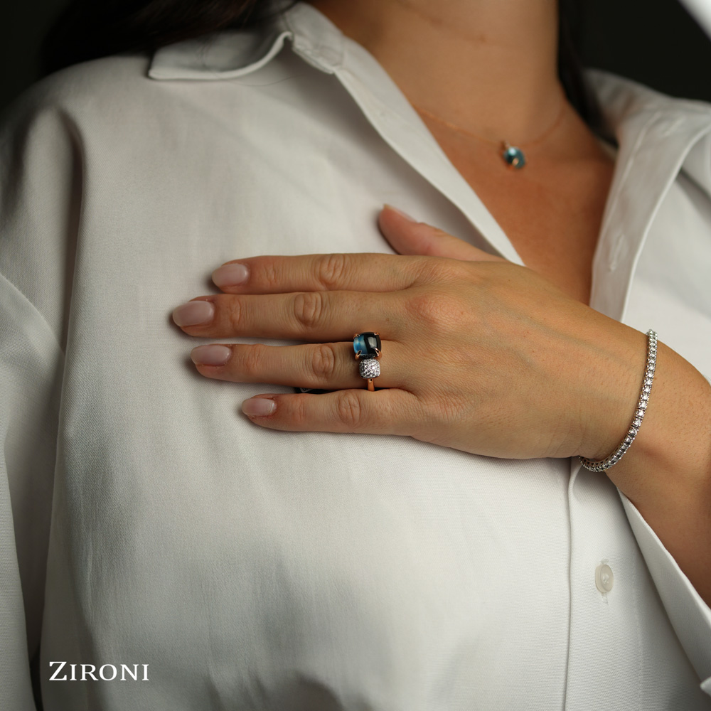 Anello in oro rosa 18K con topazio blu london cabochon (ct 6,20) e diamanti taglio brillante (ct 0,38)