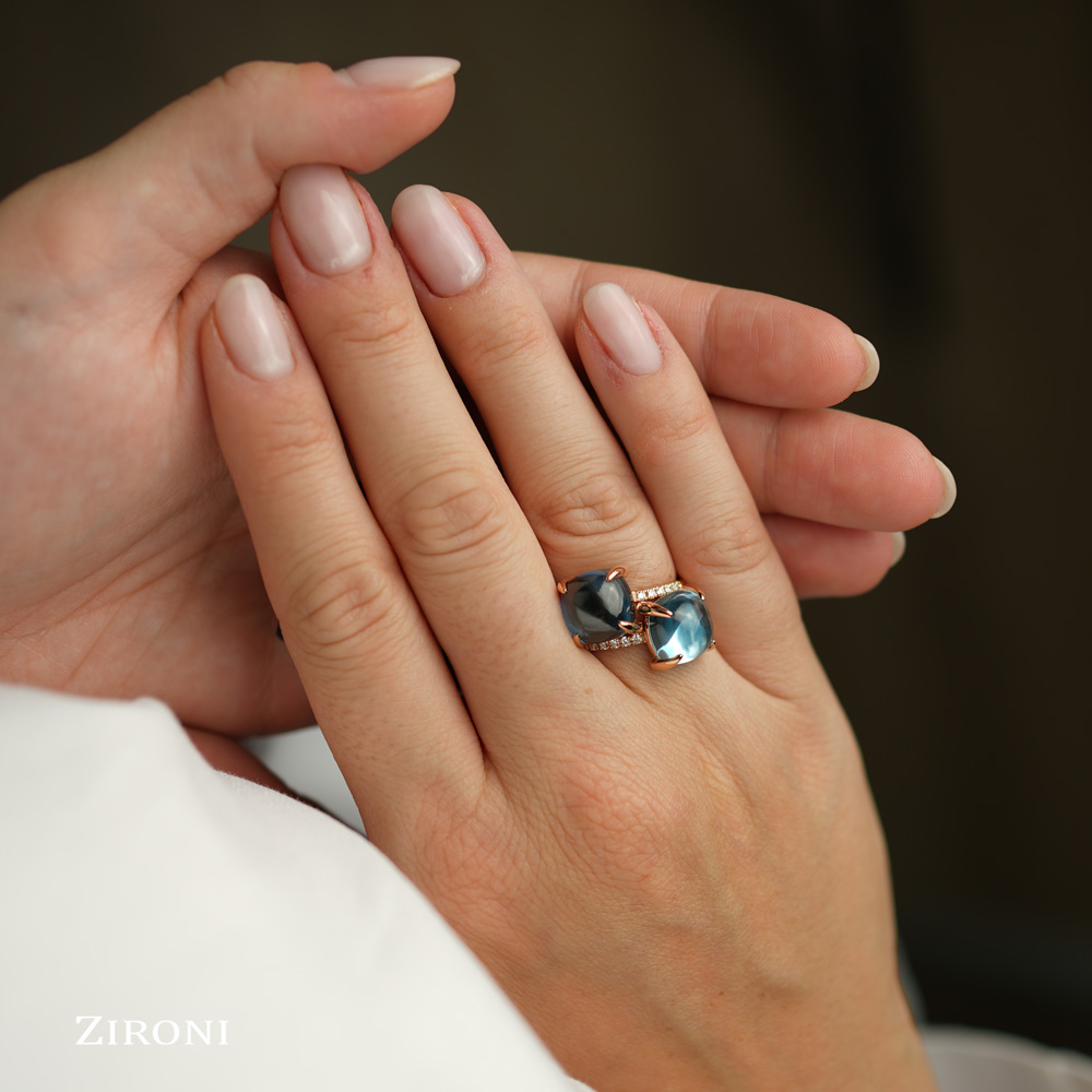Anello in oro rosa 18K con topazio blu sky cabochon (ct 6,05) e diamanti taglio brillante (ct 0,10) - mod. medio