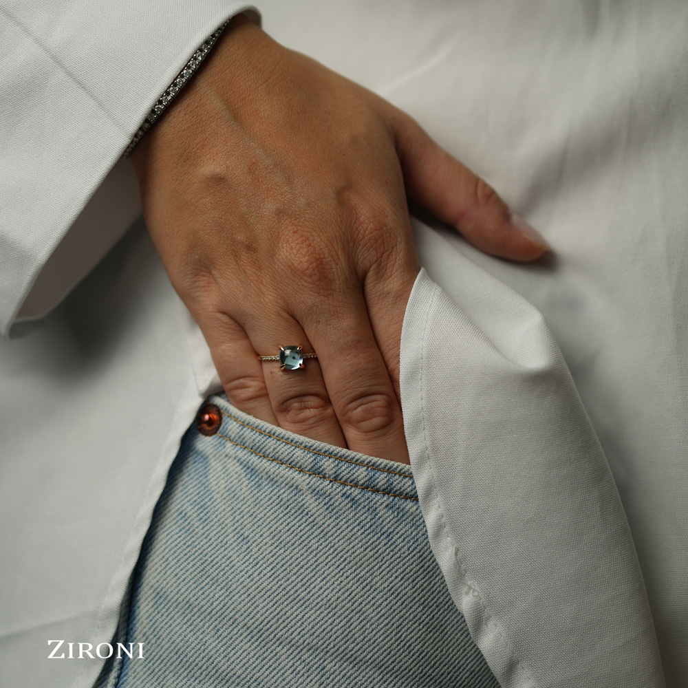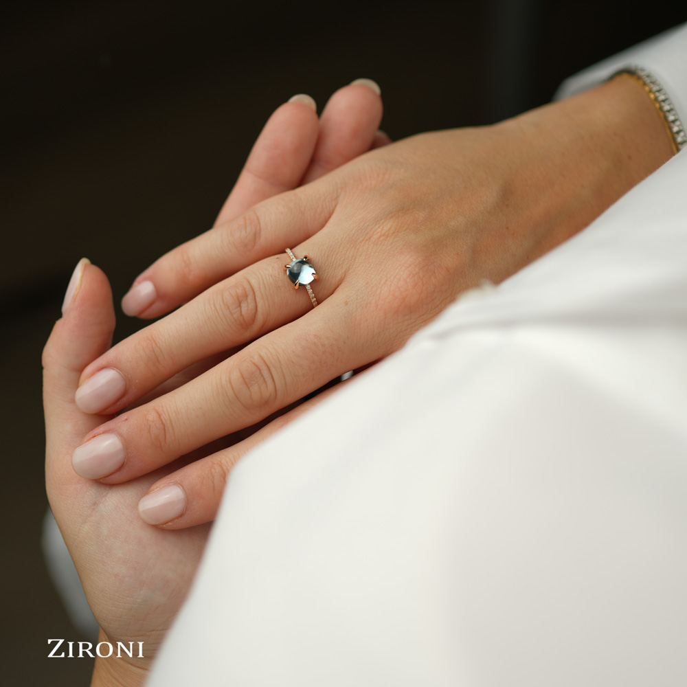 Anello in oro rosa 18K con topazio blu sky cabochon (ct 2,05) e 10 diamanti taglio brillante (ct 0,06 - G/H - VS) - mod. piccolo