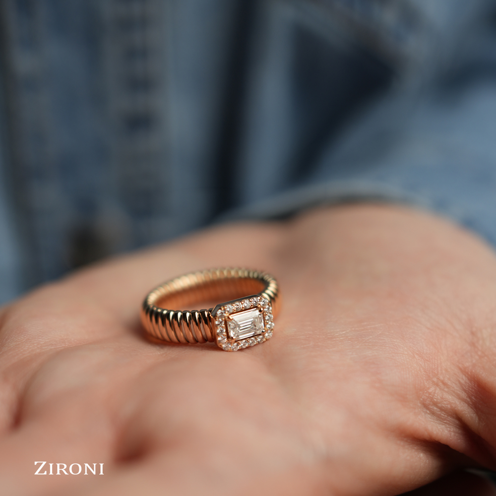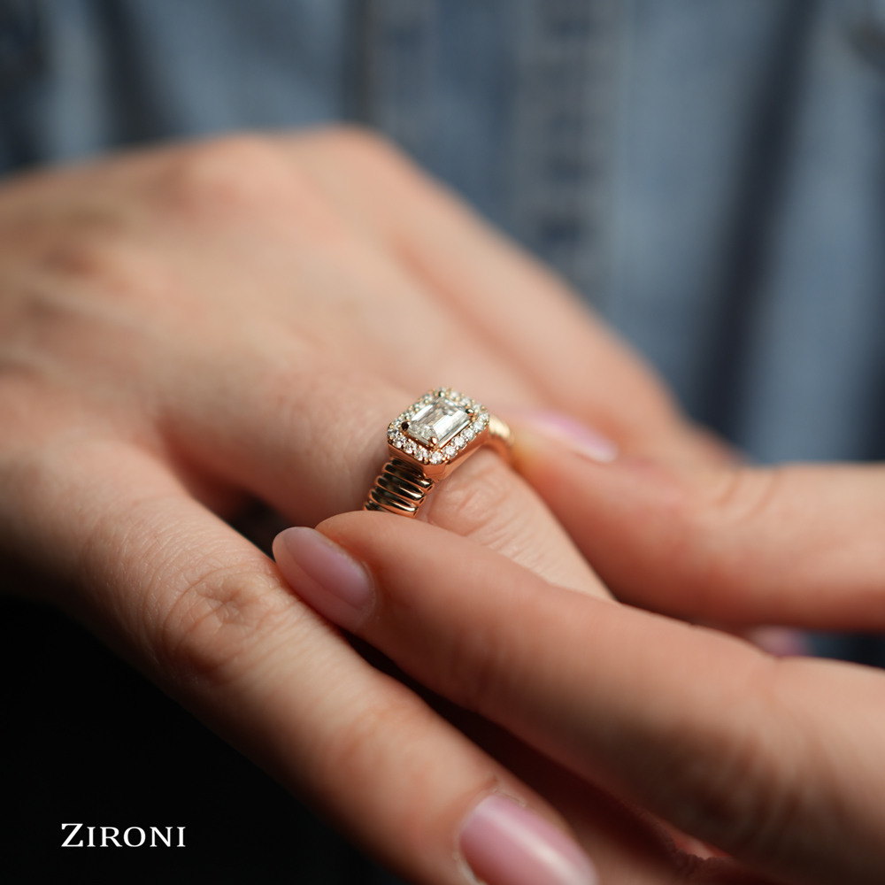 Anello in oro rosa 18K con diamante centrale taglio smeraldo (0,51 ct - F - VS) e contorno di 18 diamanti taglio brillante (0,17 ct - F - SI)