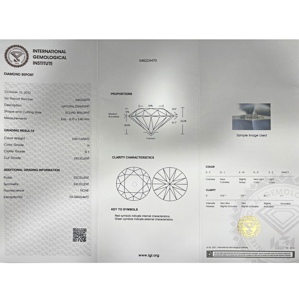 Anello solitario in oro bianco con diamante centrale taglio brillante (ct 2,50 - certificato IGI) e diamanti taglio brillante di contorno (ct 0,48)