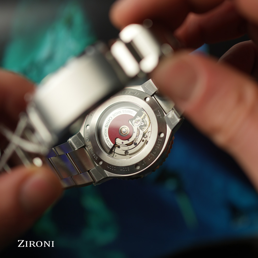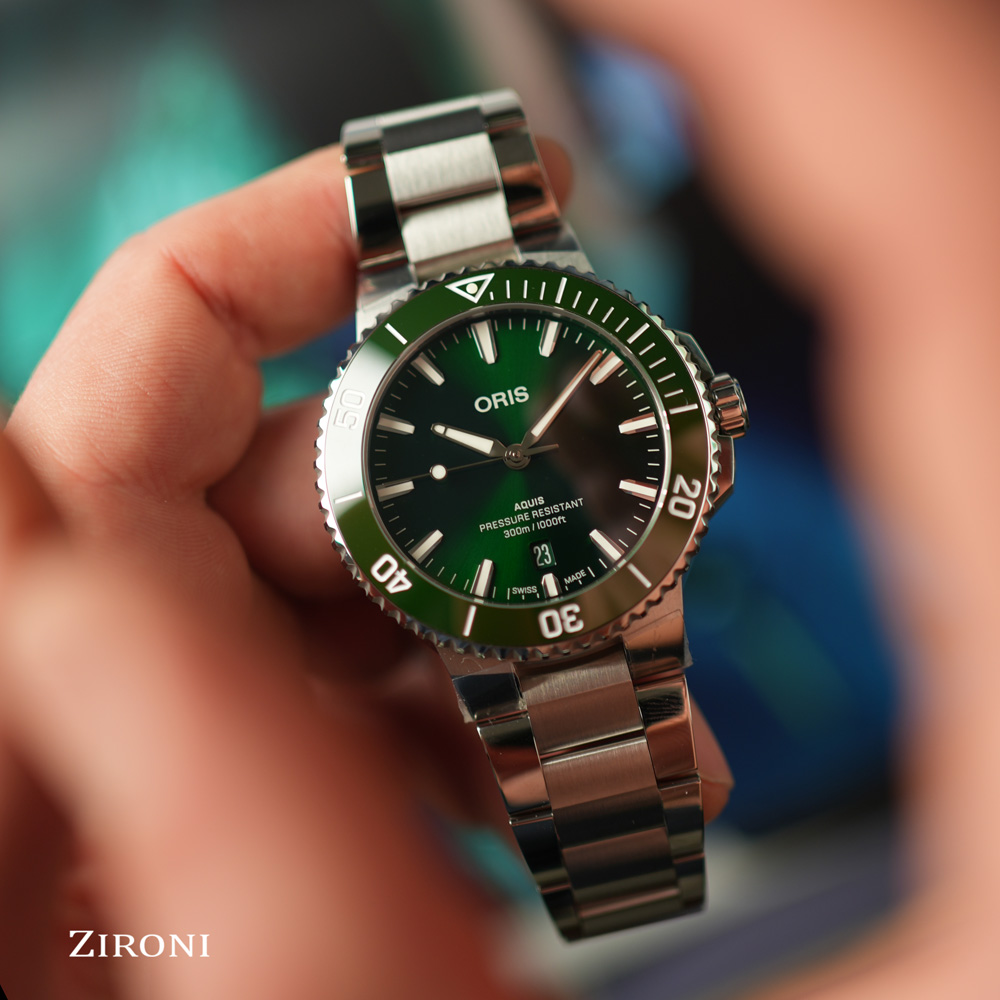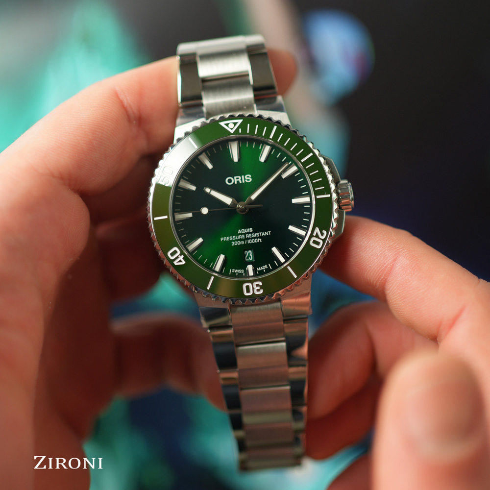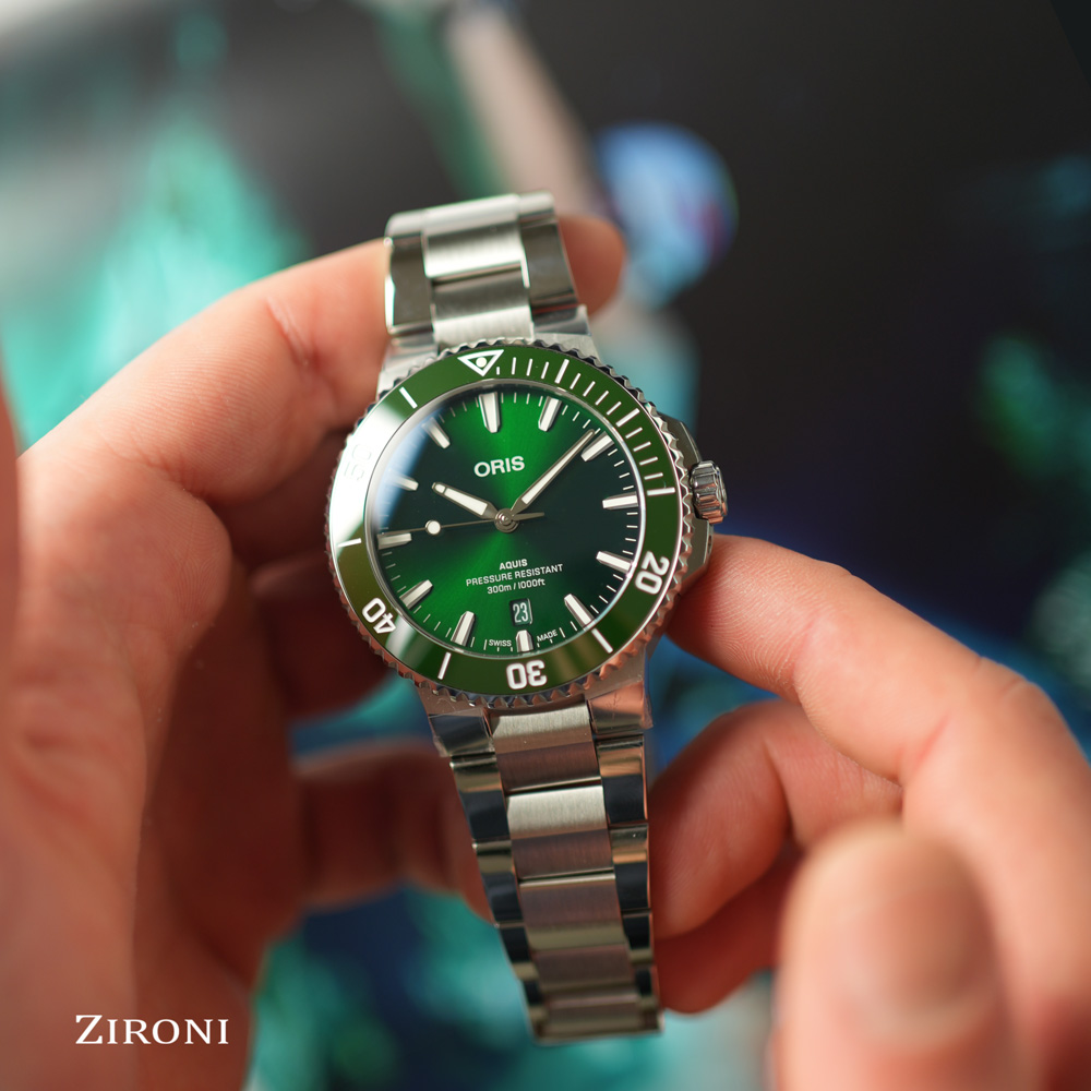 In verde, l'Aquis Date da 41,50mm diventa un simbolo di naturale raffinatezza. È un orologio di lusso per tutti i giorni, impreziosito dalla qualità costruttiva Swiss Made, dalla garanzia di un movimento meccanico automatico e da un'impermeabilità fino a 30 atmosfere (300m).