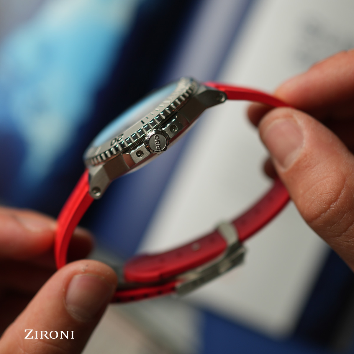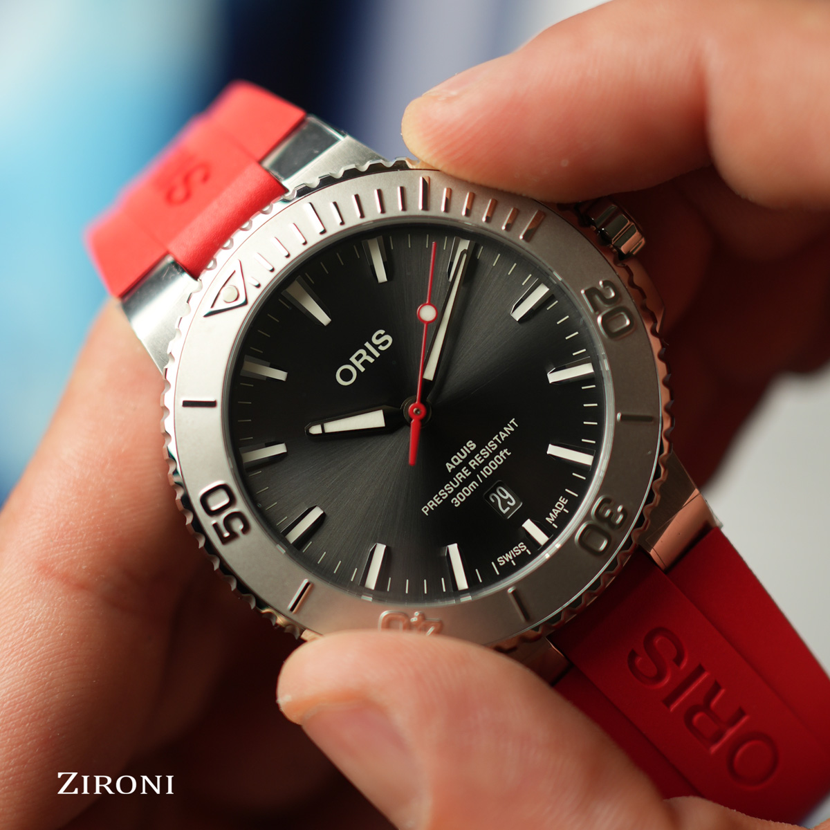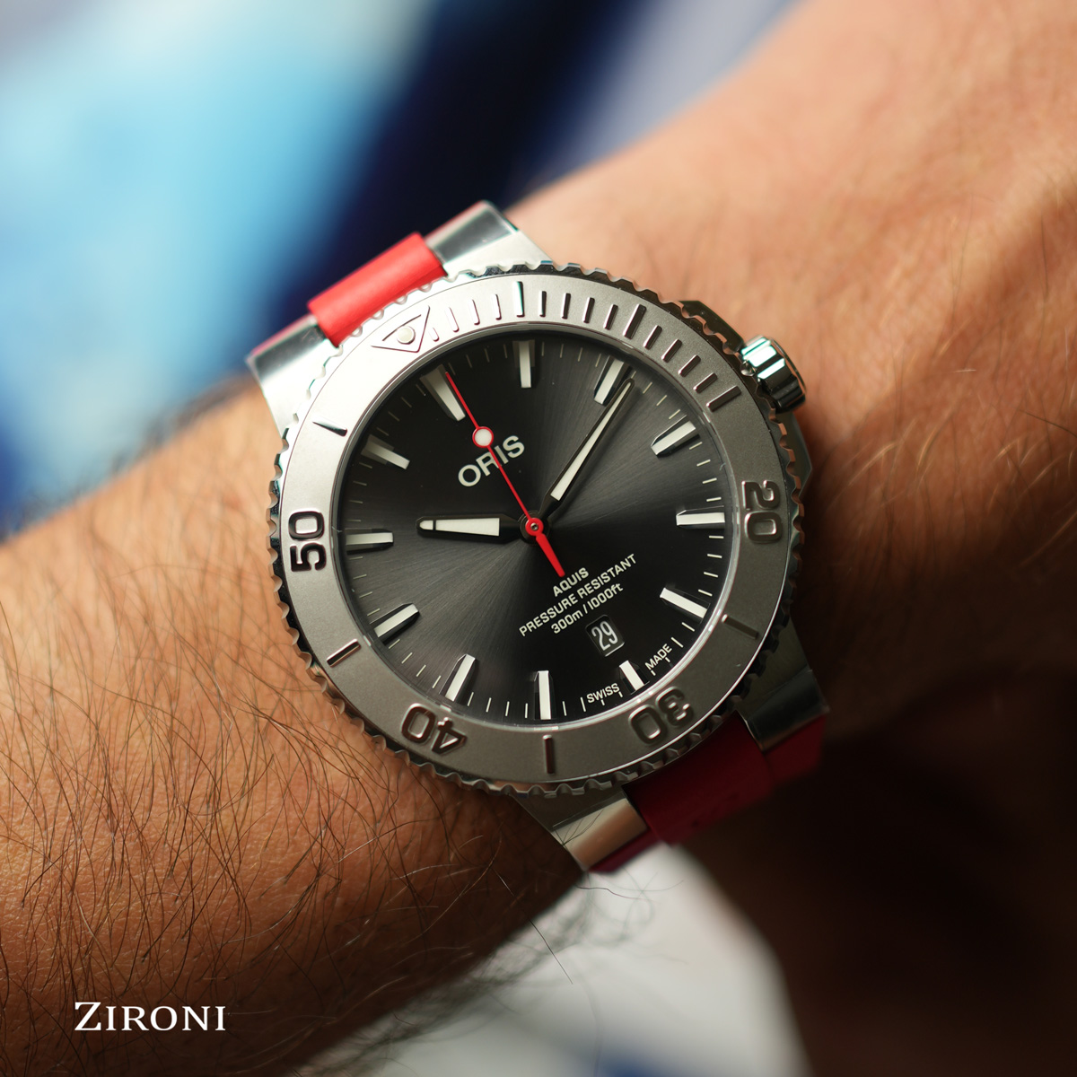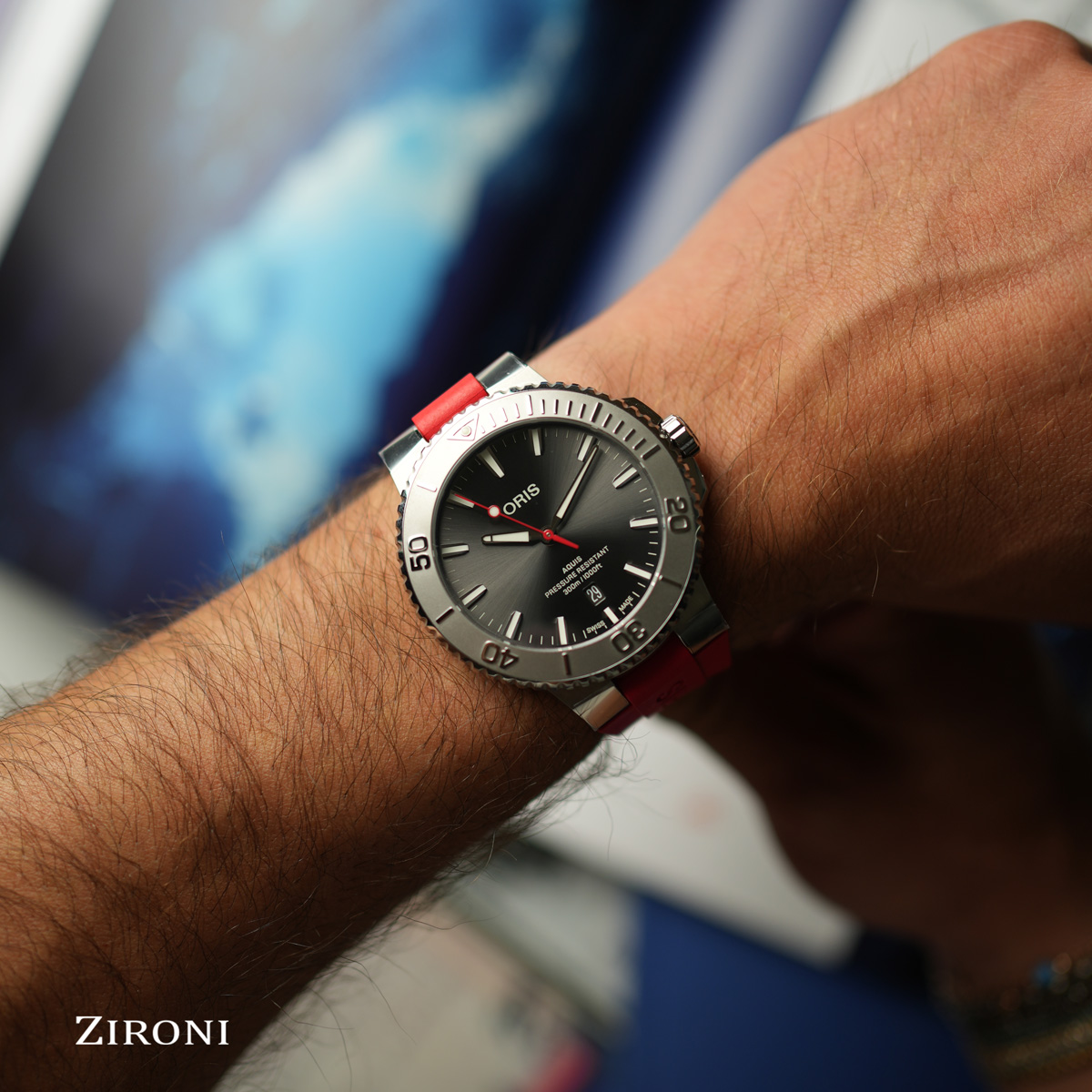 L'Aquis Date Relief, versione alternativa del nostro Aquis Date ultra versatile ad alte prestazioni. La sua particolarità è la scala dei minuti in rilievo sulla lunetta, che conferisce a questo modello una maggiore profondità. Da notare il quadrante grigio soleil in abbinamento con la lancetta dei secondi "lollipop" rossa, in esclusiva su questo modello.