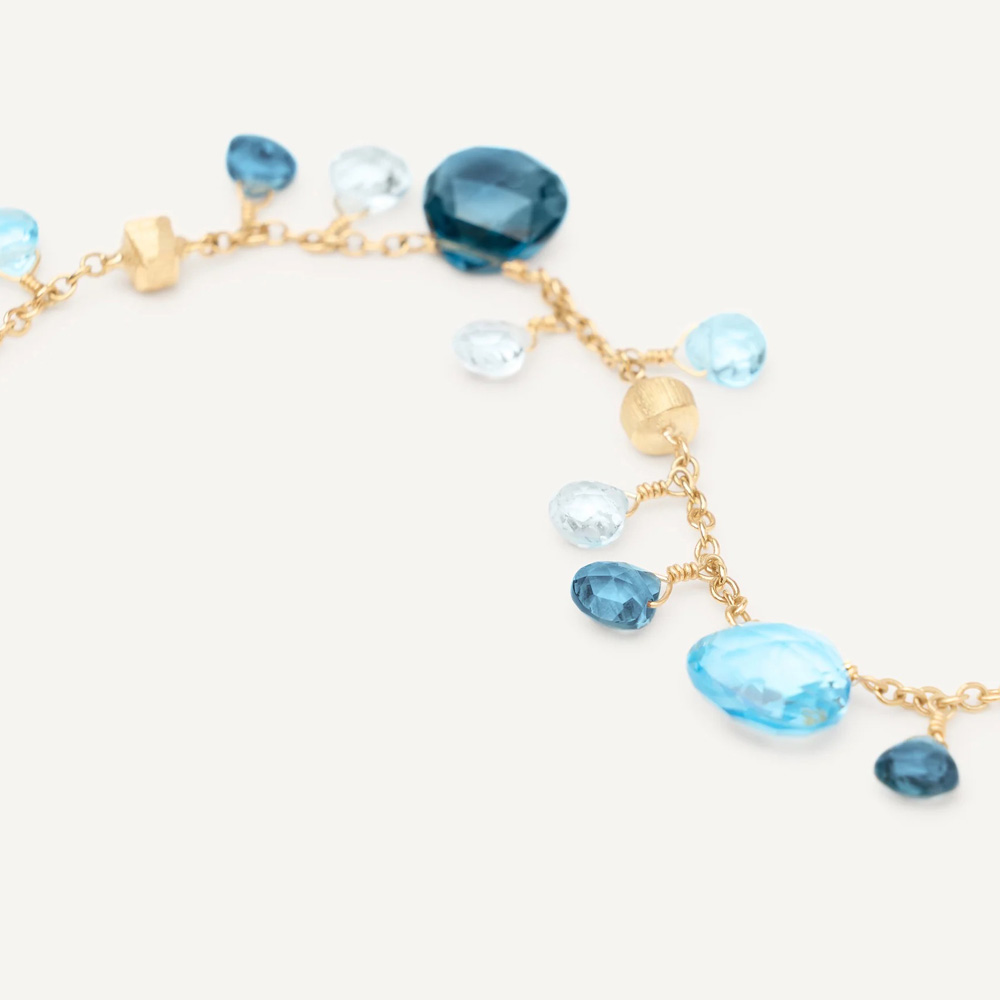 Leggero e vivace, questo bracciale a un filo è perfetto indossato da solo o abbinato ad altri gioielli Marco Bicego. Presenta selezionati topazi dal caratteristico taglio a cuore in varie tonalità di blu, da un delicato azzurro sky a blu più profondi e intensi. Le pepite in oro giallo 18 carati sono finemente incise a mano con l’antica tecnica del bulino millerighe.