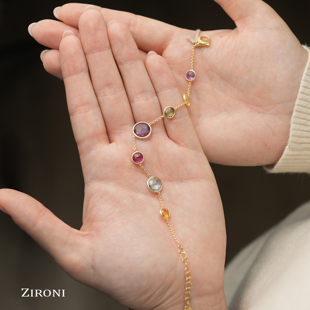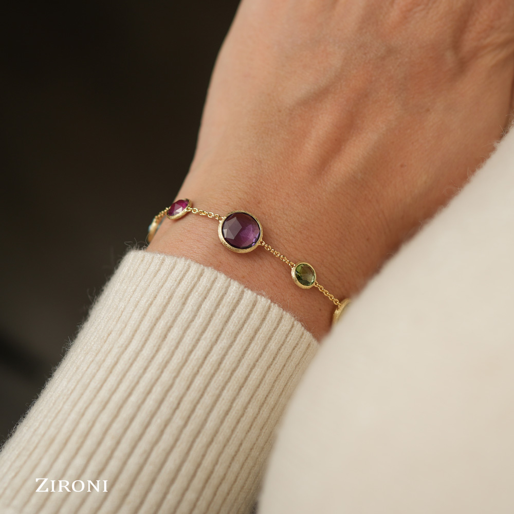 Questo bracciale, montato su una finissima catena regolabile, è il gioiello perfetto da indossare tutti i giorni: gemme colorate, accuratamente selezionate e racchiuse in una ghiera in oro giallo 18kt, finemente incise a mano con l'antica tecnica del bulino millerighe.