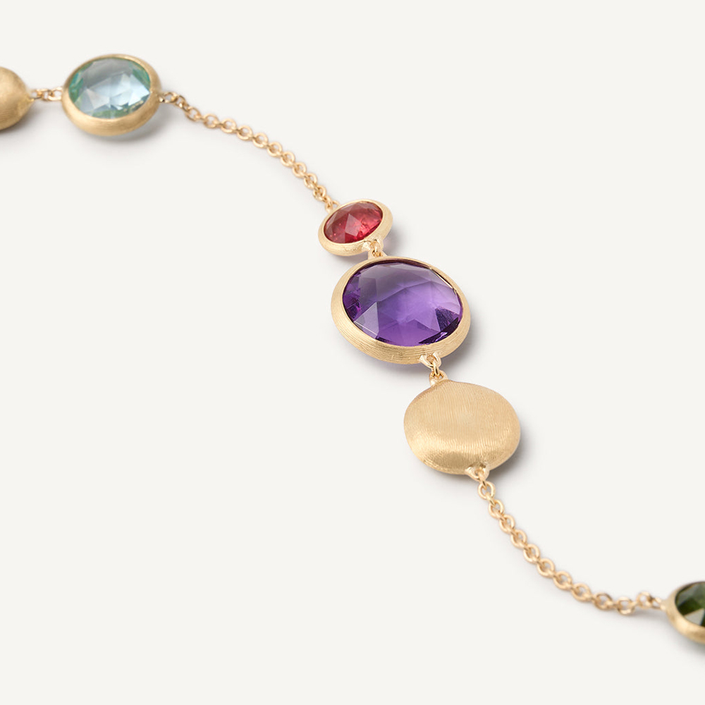 Questo bracciale, montato su una finissima catena, è il gioiello perfetto da indossare tutti i giorni: gemme colorate, accuratamente selezionate e alternate a monete d'oro giallo 18kt, finemente incise a mano con l'antica tecnica del bulino millerighe.