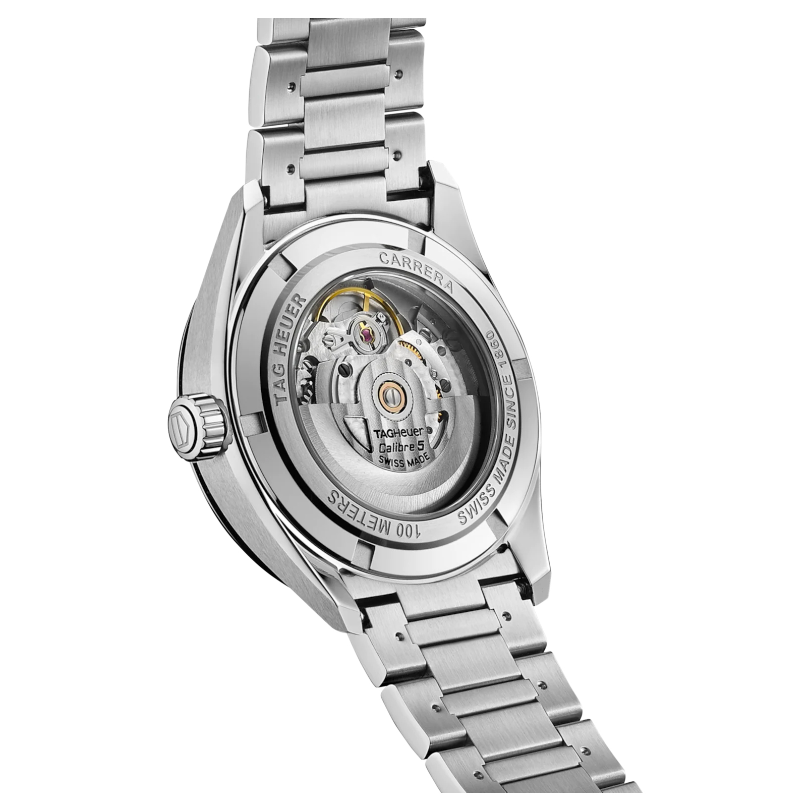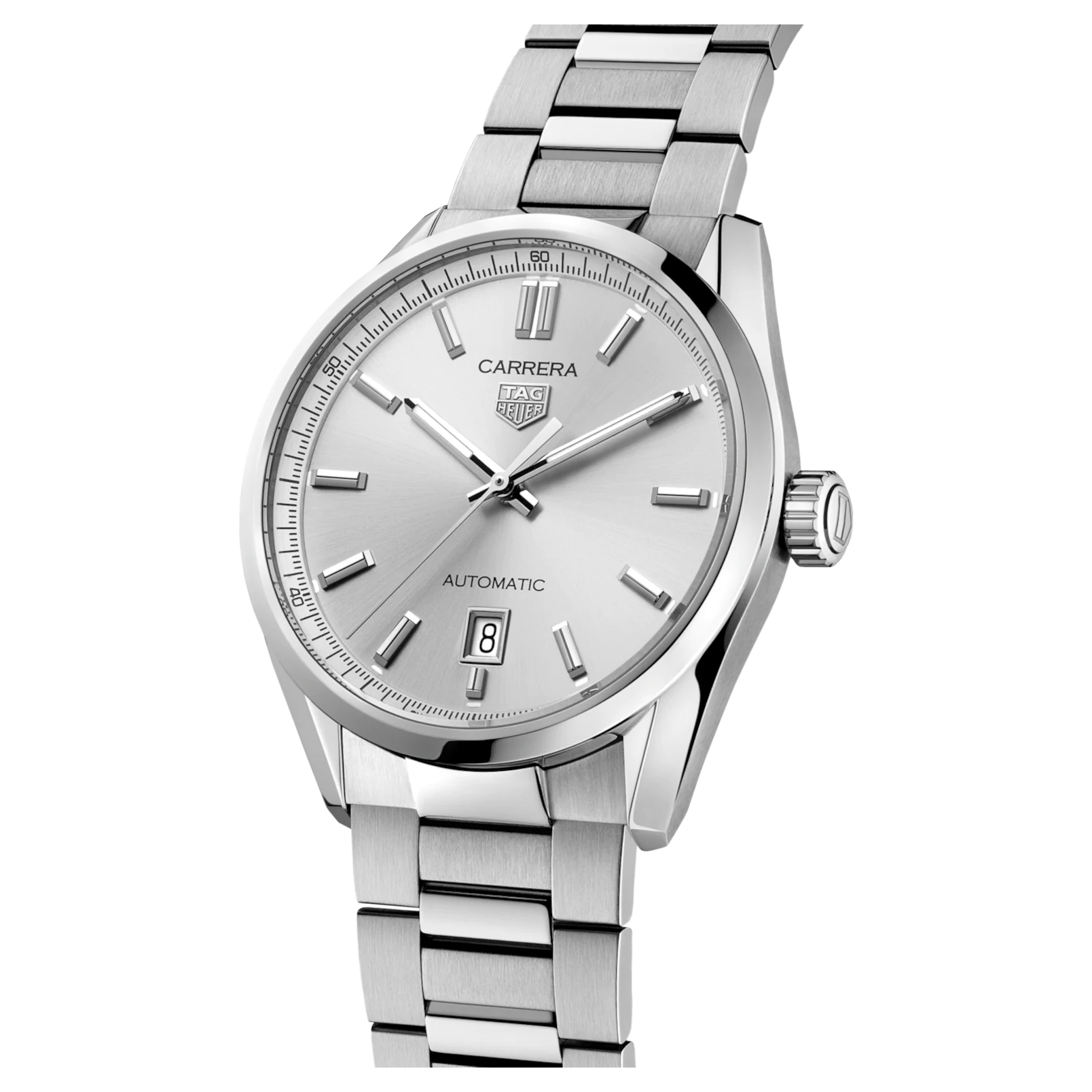 Questo TAG Heuer Carrera è pronto a tutto. Il quadrante argento spazzolato effetto soleil è un'affermazione di lusso, elegantemente impreziosito dal pratico logo TAG Heuer rodiato e da lancette e indici Super-Luminova®.