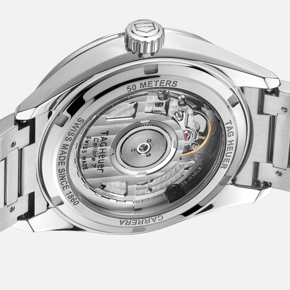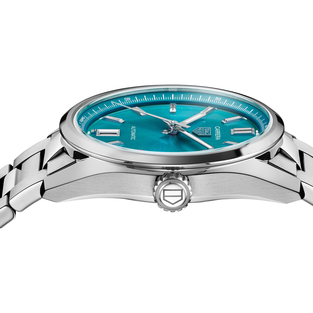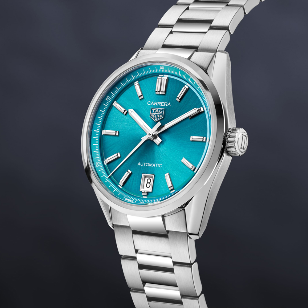 presentiamo il TAG Heuer Carrera Date da 36 mm, uno straordinario segnatempo con quadrante blu turchese spazzolato con finitura circolare e robusta cassa in acciaio. Progettato all'insegna dell'eleganza e della precisione, offre un mix di stile e funzionalità.