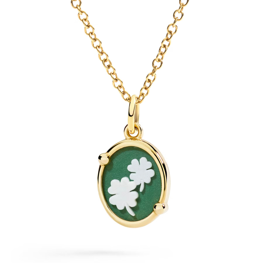 Il Cammeo di DoDo un piccolo capolavoro di arte orafa: in porcellana verde e bianca, ha una cornice ribattuta a mano in oro giallo 9K. Sul retro un’incisione con la scritta ‘Good luck’, mentre al centro del portafortuna, c’è un openwork a forma di quadrifoglio.