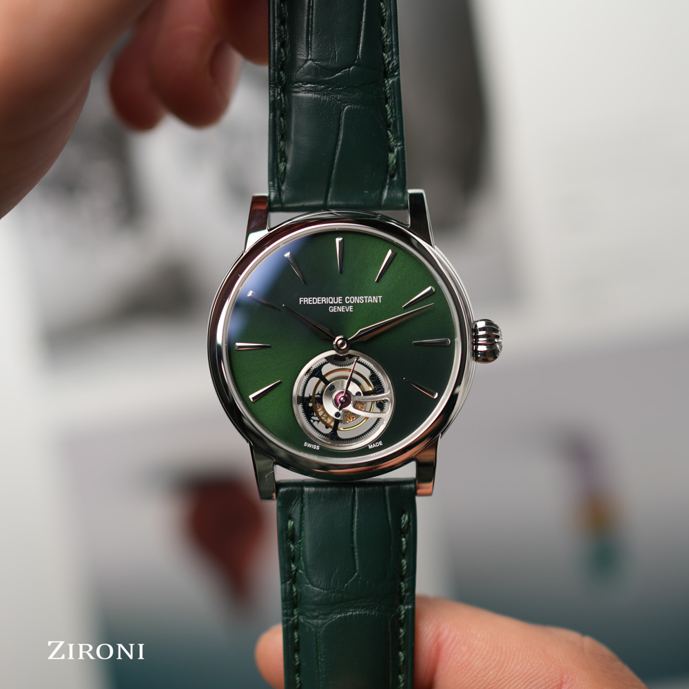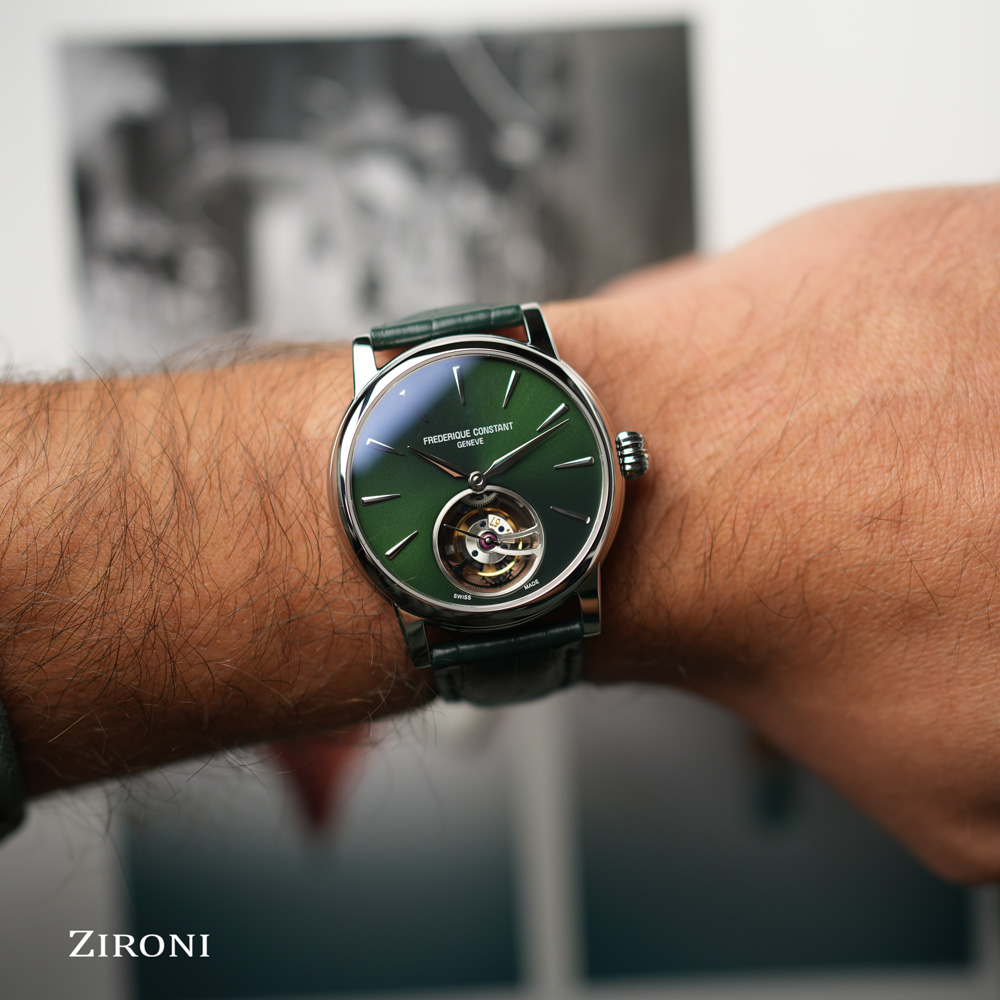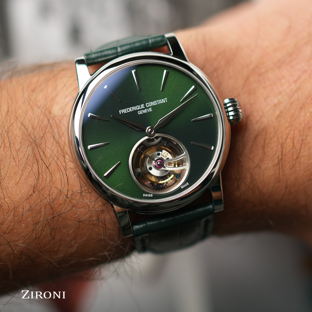 Prodotto in soli 150 esemplari, questo classic tourbillon manufacture si distingue per la cassa in acciaio da 39 mm, il quadrante verde a raggi di sole e il cinturino abbinato. al suo interno batte il calibro automatico fc-980-4, sviluppato e assemblato in svizzera