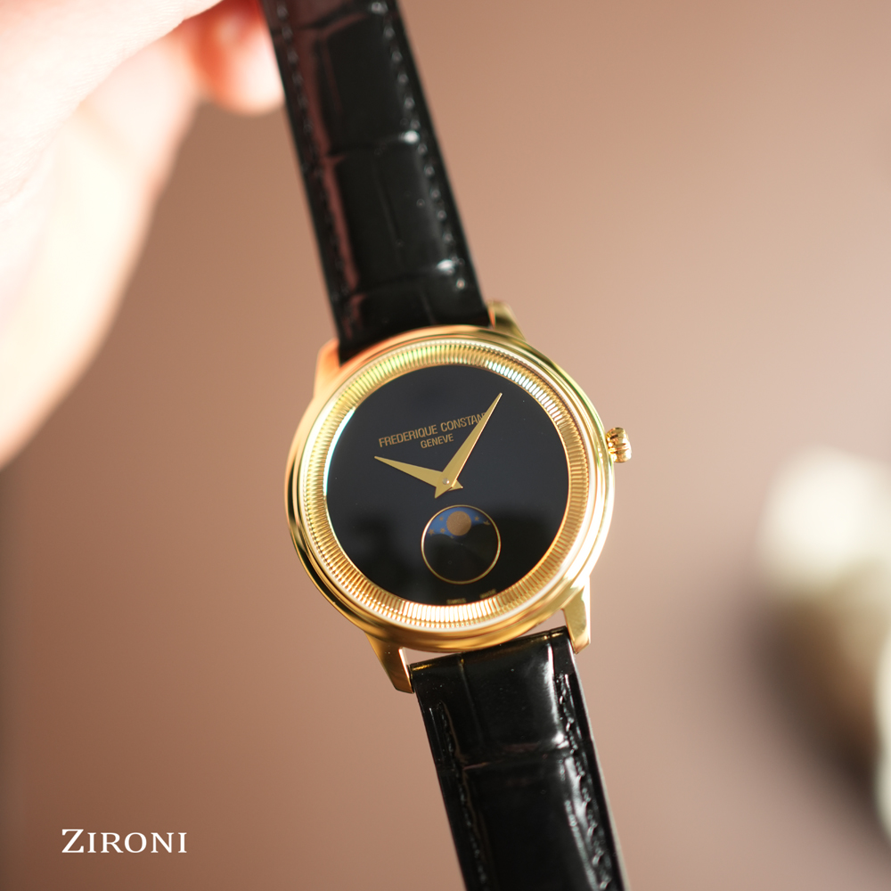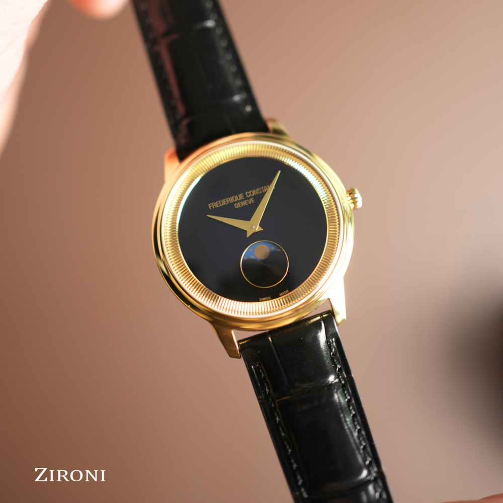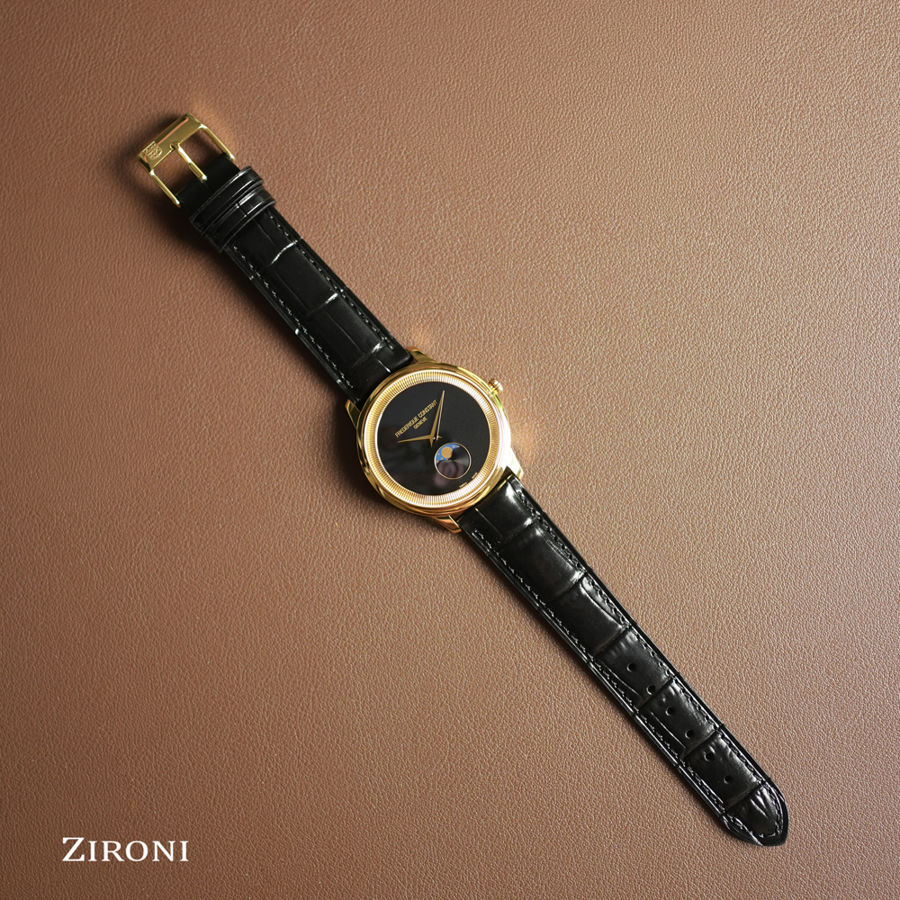 Un modello da 37 mm rivestito in PVD oro giallo lucido. La sua cassa sottile 7,65 mm incornicia un quadrante nero opaco, il cui anello interno scolpito, modellato come il bordo di una moneta, gli conferisce un carattere unico. Seguendo le lancette color oro, la luna rivela il suo ciclo alle ore 6, infondendo al tempo una poesia perpetua. Protetto da un vetro zaffiro convesso, questo segnatempo ospita un calibro al quarzo FC-206 di grande affidabilità (autonomia di 60 mesi). Un elegante cinturino in pelle di vitello nera con motivo coccodrillo completa questo classico capolavoro.